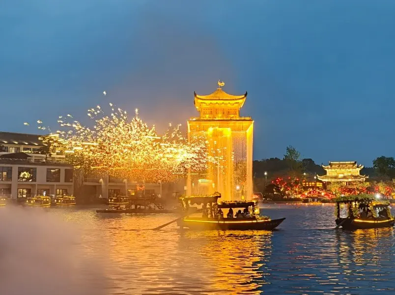 🌌傍晚的婺女洲直接美哭!蓝调夜空是清冷的底色,文墨塔的蓝金灯光像把星河揉碎了洒在塔上,打铁花炸开的瞬间,金色星火簌簌坠入湖面,灯笼街的暖红光影晃呀晃,氛围感直接封神!