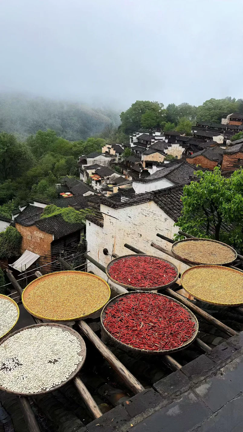 🌞早上的篁岭也太会了吧!白墙黛瓦是温柔的米白底色,屋顶晒秋的红辣椒、黄稻谷撞出元气满满的红与金,山间层层叠叠的绿直接把眼睛养舒服了!水街乌篷船慢悠悠划过,红灯笼在风里晃呀晃,山涧瀑布清清凉凉,每一帧都是鲜活又治愈的色彩暴击📸