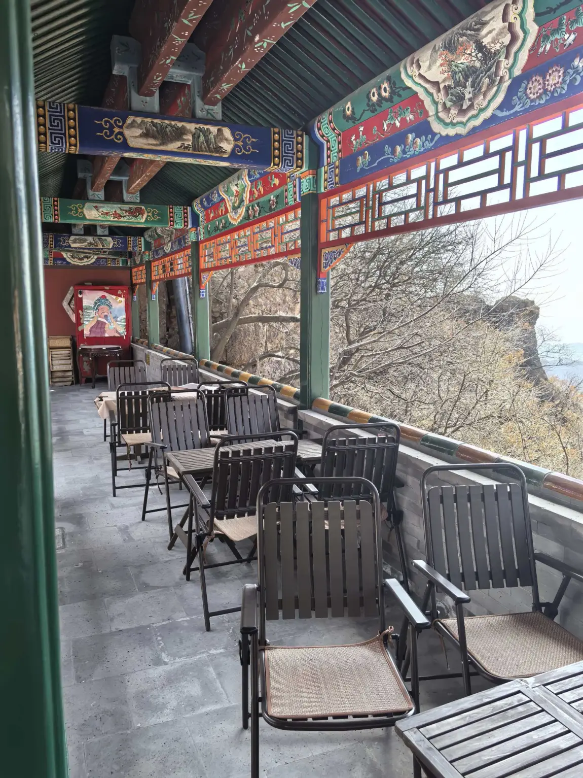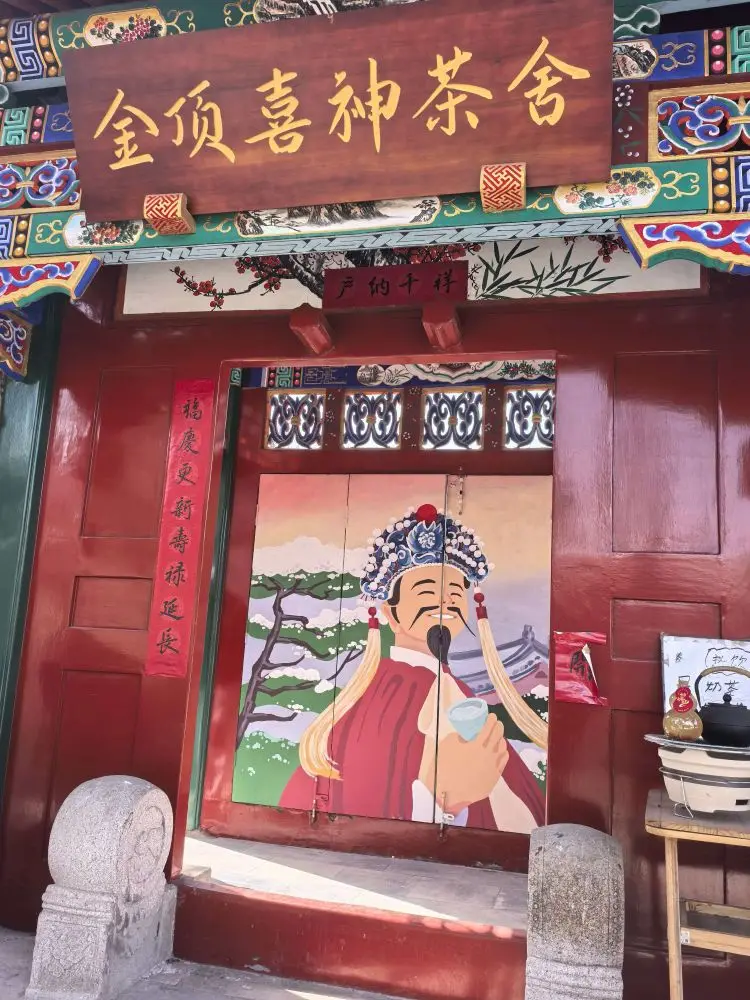 半山腰的「金顶喜神茶舍」更是惊喜!古色古香的门脸,喜神壁画俏皮可爱,坐在临崖的茶座上,点一杯热茶,看远山层叠、听山风穿林,偷得浮生半日闲,大概就是此刻的模样。