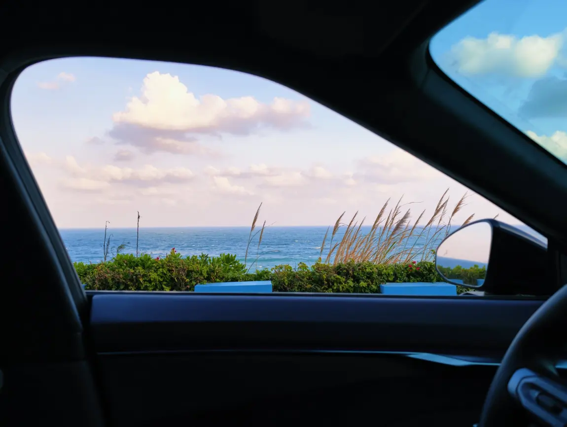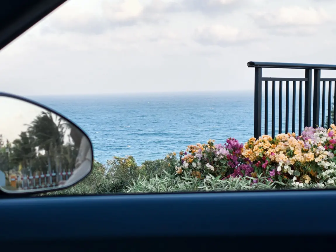 一边是一望无际的蔚蓝大海,三角梅在风里开得热烈,后视镜里还映着椰林与晴天。