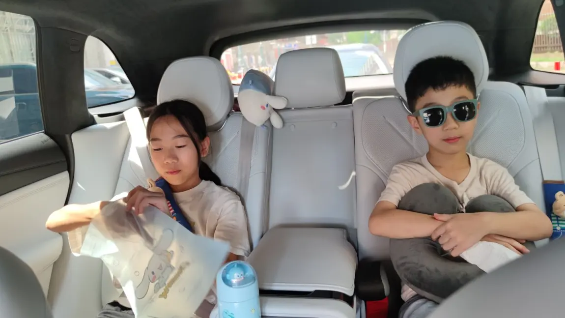 坐进车里,两个娃一到后排就彻底放飞了。G9 的空间真的是二胎家庭的福音,横向宽度足够两个孩子并排坐,互不打扰;纵向头部空间更是宽敞,无论把怎么坐都毫无压力,坐得舒适,父母才能享受片刻清净。