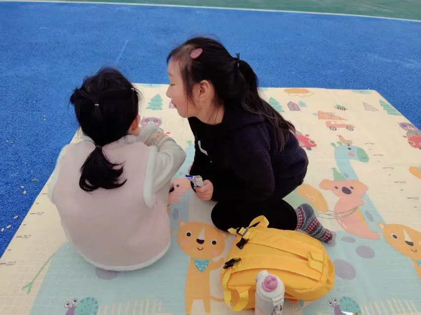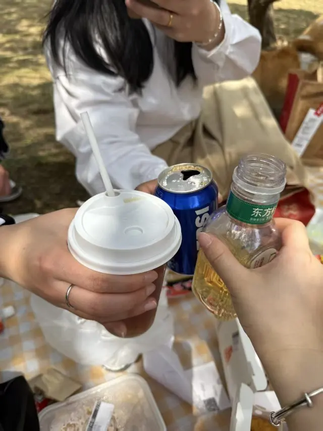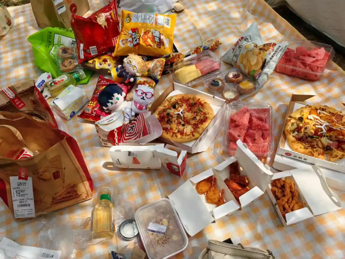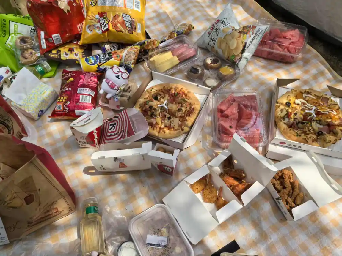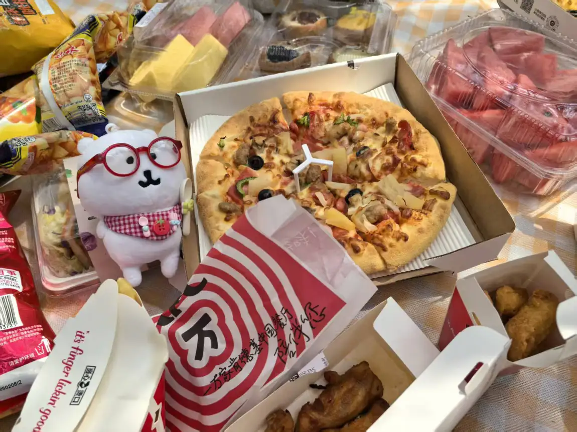 下午茶就是简单买点水果、蛋挞、小蛋糕🍓🥧,没有很精致,就是孩子爱吃就行。野餐垫一铺,肯德基、披萨随便对付一顿🍔🍕,大人小孩都满足,小狗也在旁边蹭吃蹭喝,热闹得很。