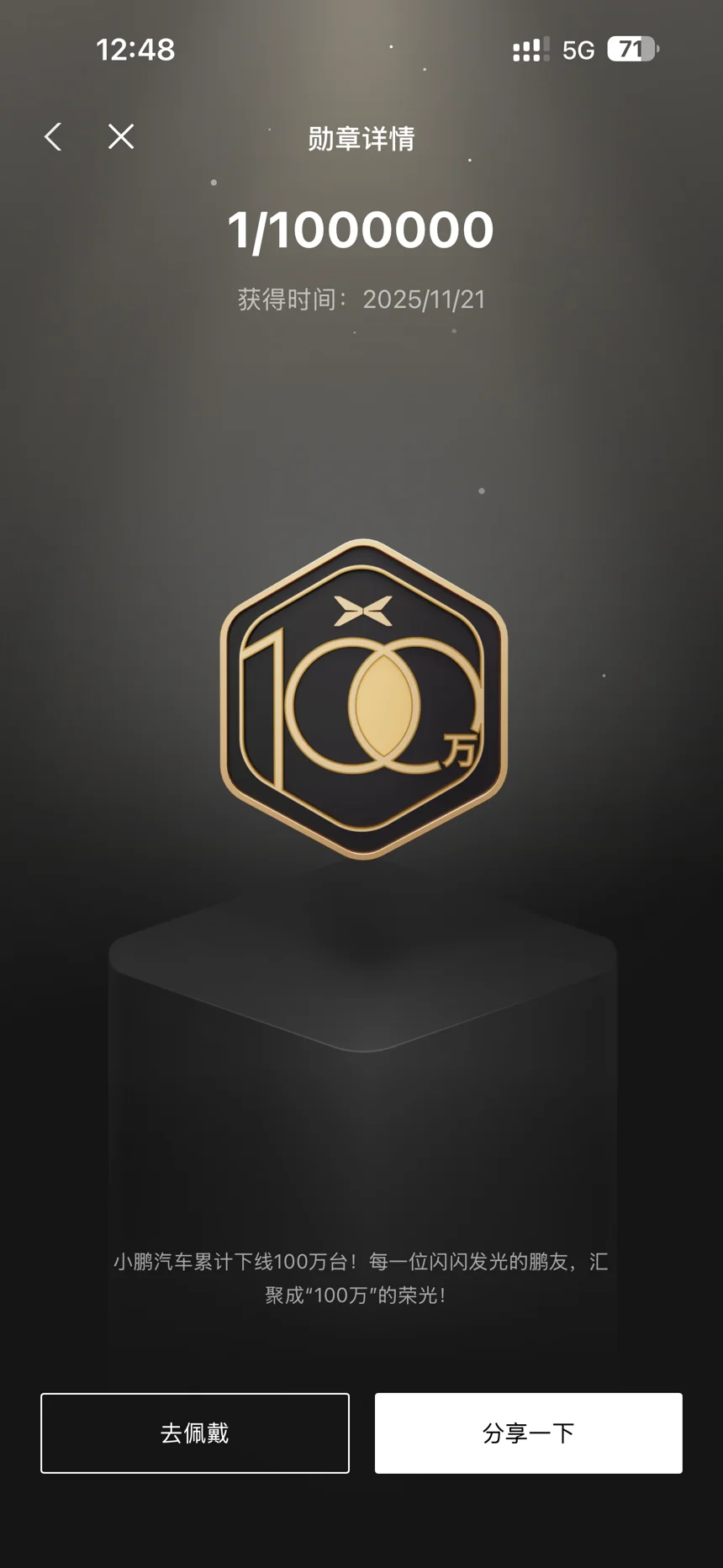 最最最爱的还是这枚「100万台下线纪念章」,1/1000000的编号,是和小鹏双向奔赴的见证,也是百万鹏友共同的荣光!