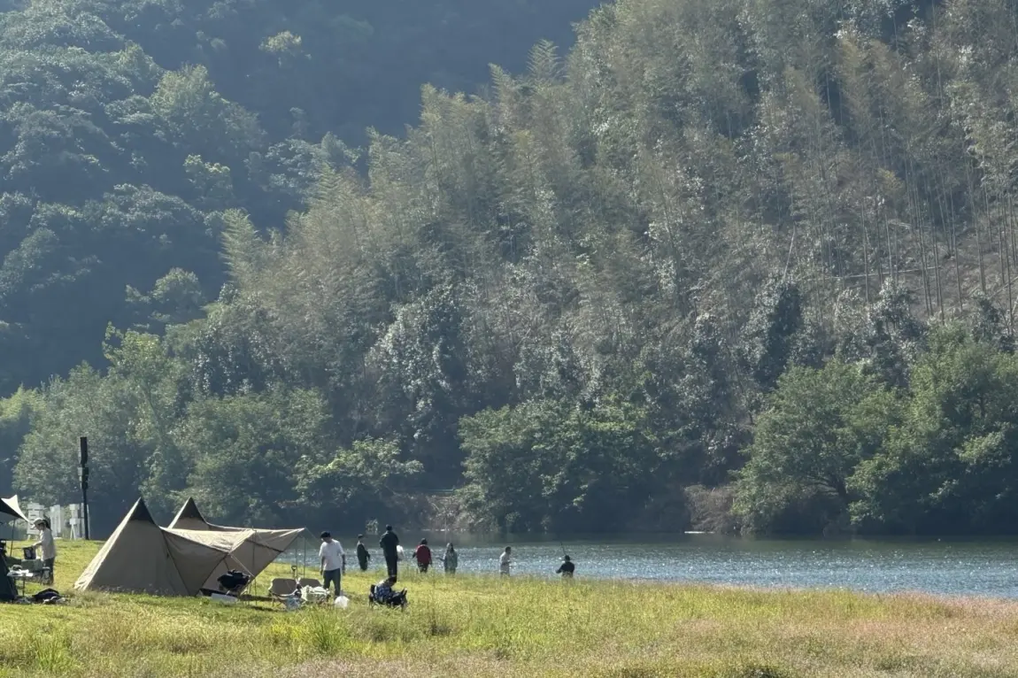 先夸爆我的宝藏露营地——皖南川藏线真也天境,绝对是被上帝偏爱的地方。它依山傍水,背靠连绵青山,山间云雾缭绕,风一吹就能闻到草木的清香;面前是澄澈的水域,波光粼粼映着蓝天绿树,偶尔有微风拂过水面,泛起细碎涟漪,随手一拍都是无需修图的美景。傍晚时分,夕阳西下,金色的余晖洒在山水间,远处的山峦被染成暖橙色,近处的水面波光闪闪,那一刻,所有的疲惫都被这治愈的景色消解。