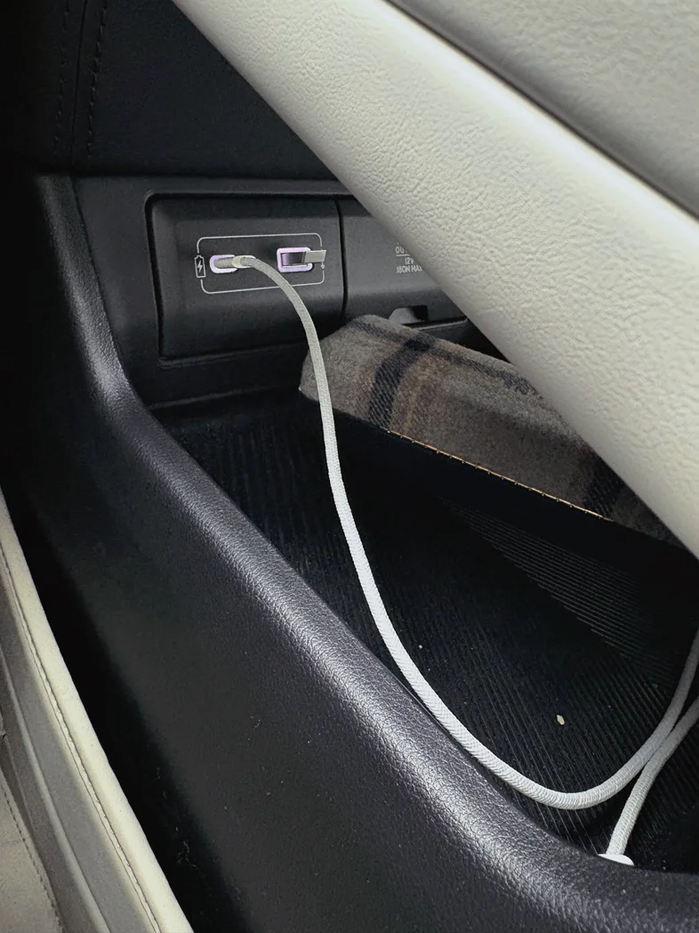 ⭕前排扶手箱 USB 位 + 储物格:中控扶手下方,不仅有 Type-C 充电口,下方的储物格刚好能收纳充电线、湿纸巾等小物件,既不挡视线,又能随手取用,完美解决后排充电线杂乱的问题。