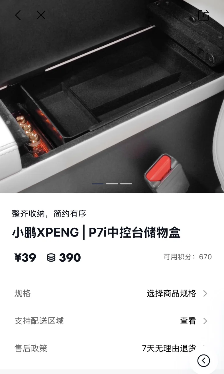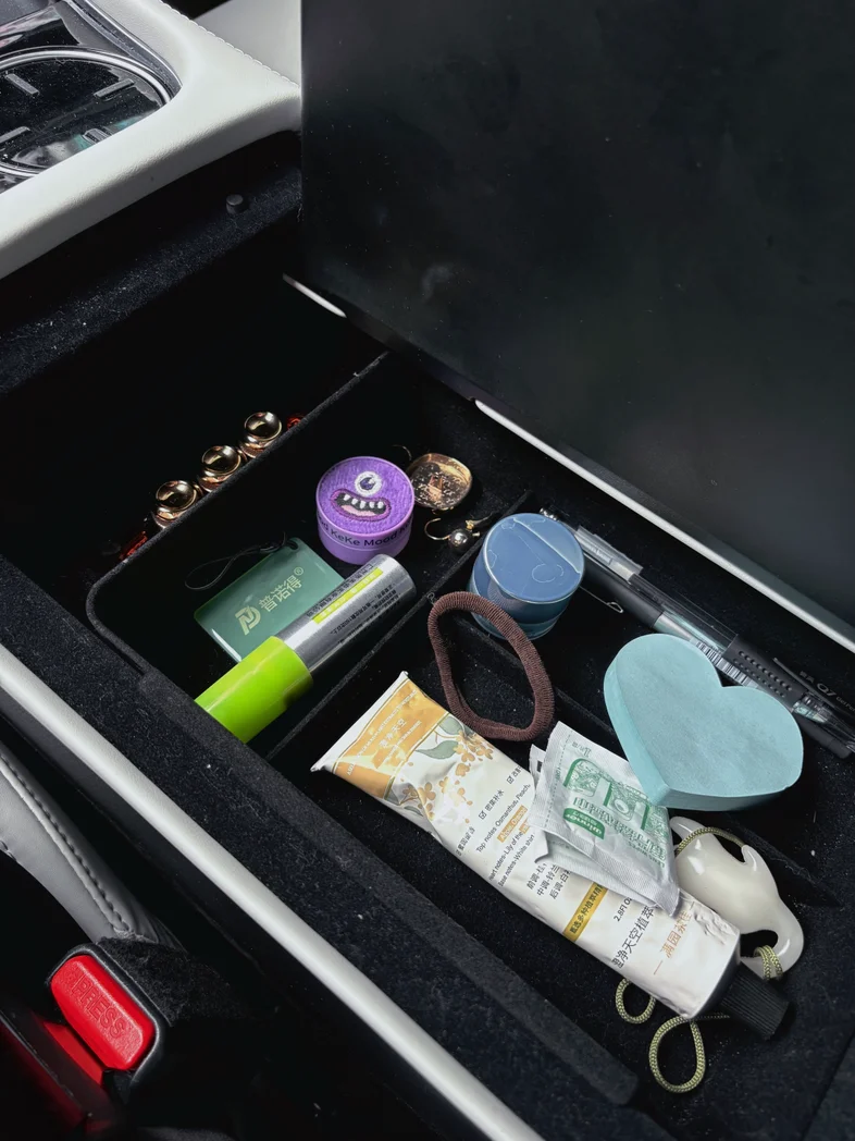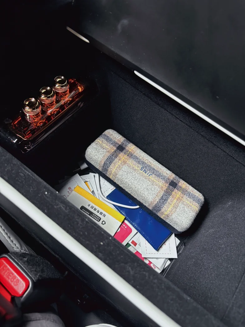 ⭕中控储物区收纳:手套箱空间充足,直接堆放易杂乱,我用官方商场购买的P7i专用中控储物盒可完美解决,它贴合中控凹槽、免打孔安装,左侧放车载香薰,中间格收纳行驶证、票据,右侧格放笔、便签等小物件,绒面内衬护物且杜绝异响,39元即可让中控告别凌乱、兼顾颜值与实用。上层放抽纸、口罩等常用品,下层收纳车辆说明书、应急工具等低频物品,分类清晰、取用便捷;原厂中控储物无明确分区,小物件混放既杂乱又易产生异响