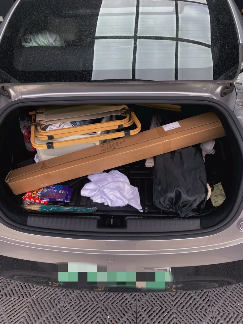 ⭕后备箱纵深利用:P7i作为轿跑,后备箱的纵深空间是一大优势,即便溜背造型,纵深也足够容纳不少物品。我用两个尺寸适配的收纳箱进行分层收纳,上层放露营装备、购物袋等常用物品,下层放应急工具、洗车工具等不常用物品;出去露营如天幕杆沿车身纵向摆放,贴合后备箱两侧轮廓,不浪费一寸空间,也不会影响后备箱盖板闭合。露营装备繁杂,收纳的关键是“分类清晰、拿取方便”,避免翻来翻去耽误时间。