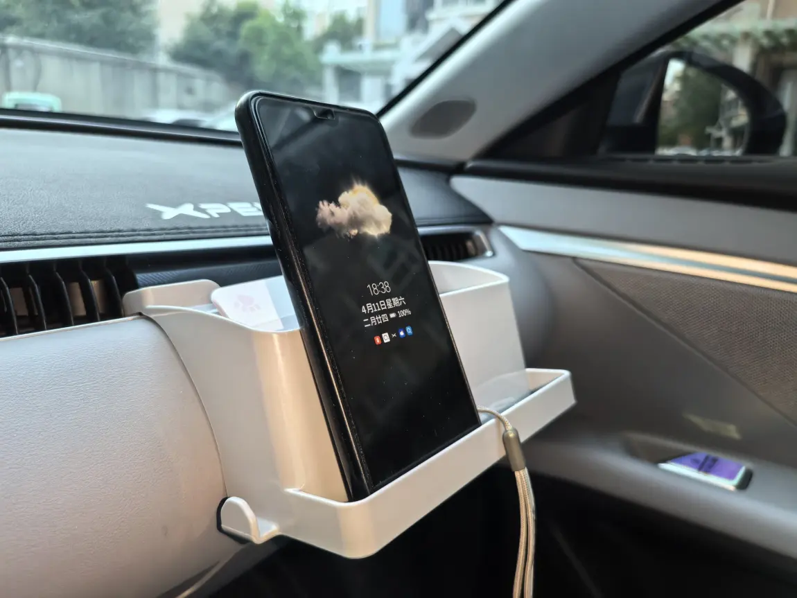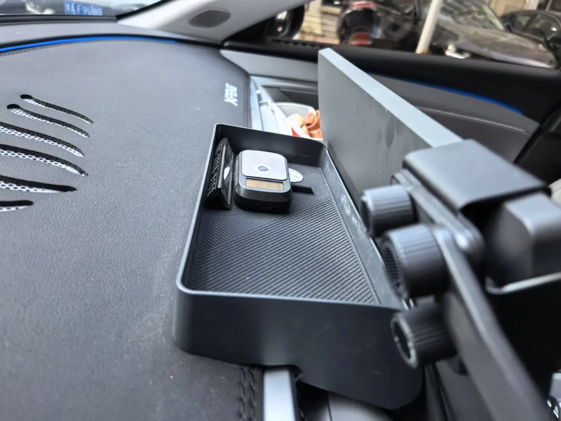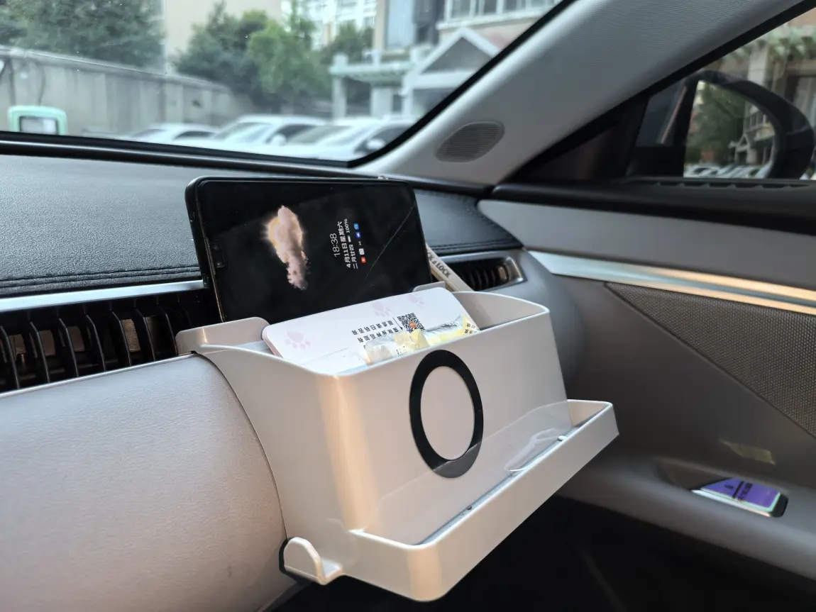 M03流线型外观,让前挡风玻璃压低了很多,再去贴个ETC,挺难看的,大屏幕后安排一个置物垫,放ETC,加一个纸巾位(我的纸巾不放这里)