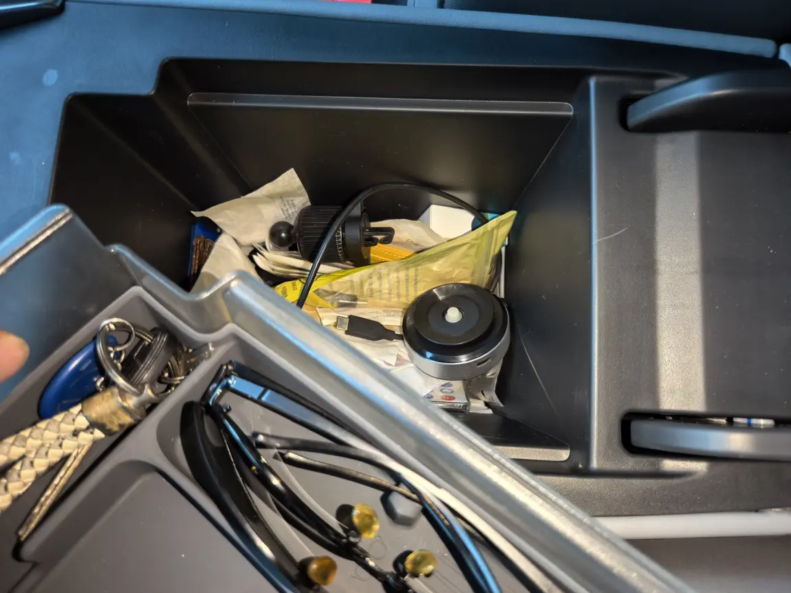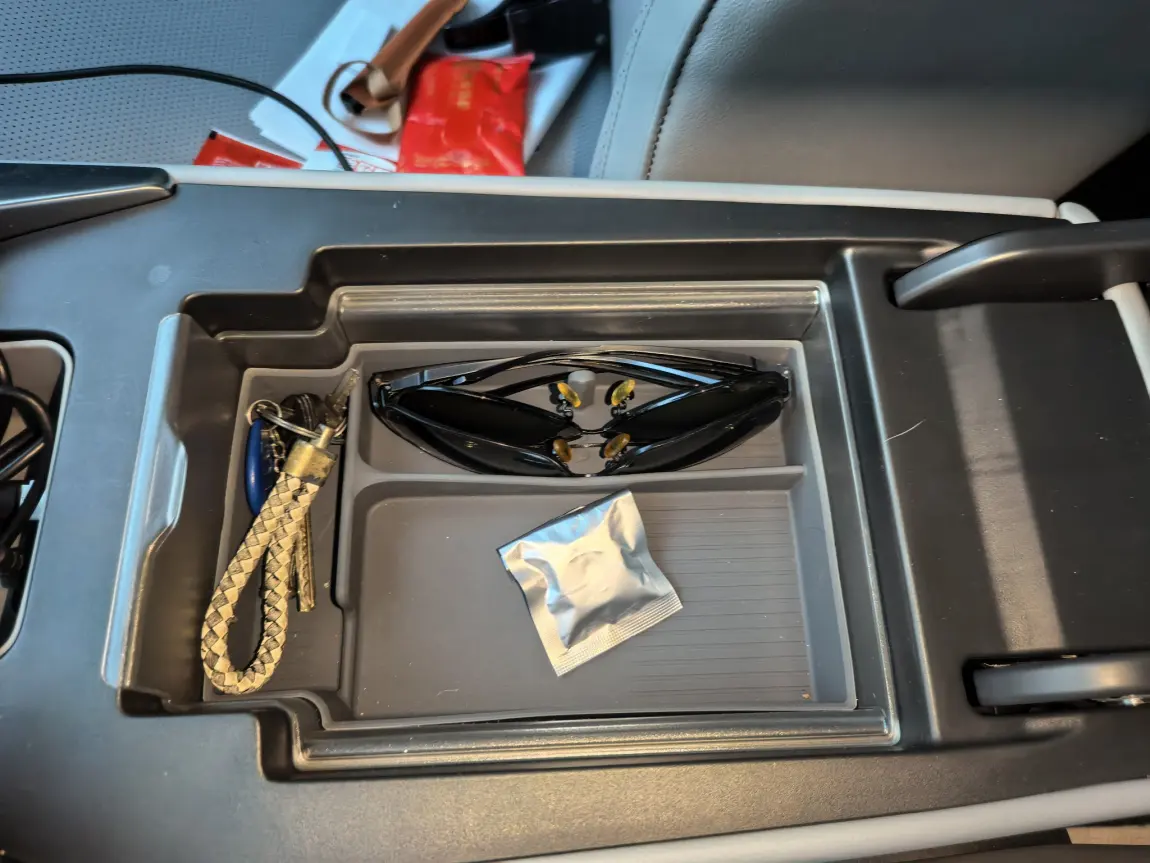 驾驶位胳膊肘下的扶手箱内,一个分层设计的收纳隔板,藏了小组件,也让这车没有眼镜盒的弊端,有了改造,凑合着用吧
