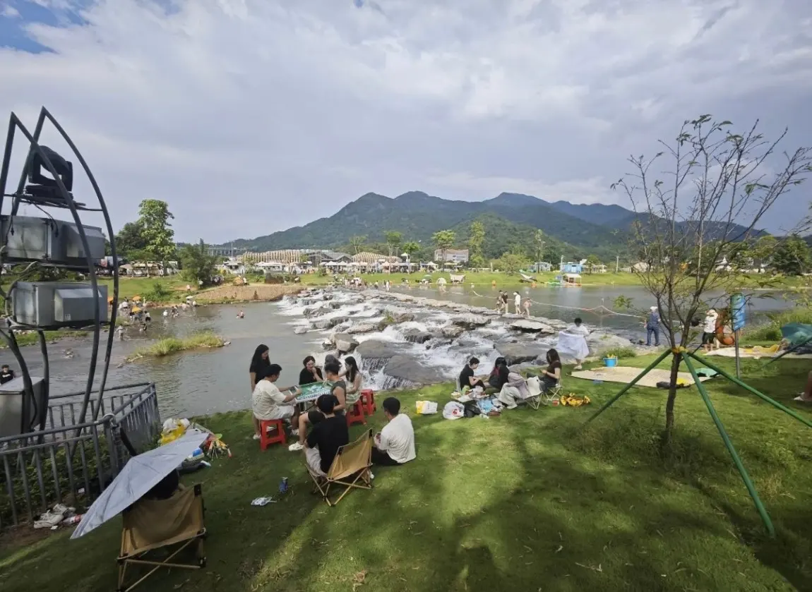 这是我私藏的广州周边宝藏玩水地。青山环绕,溪水从乱石滩上缓缓流过,形成一道道温柔的白瀑。夏天在这里,踩着凉丝丝的溪水,听着潺潺流水声,所有的燥热瞬间消散。草坪上支起折叠椅,朋友围坐一桌,大家聊聊天、吹吹山风,这种不被打扰的惬意,就是广州人最爱的周末慢生活。