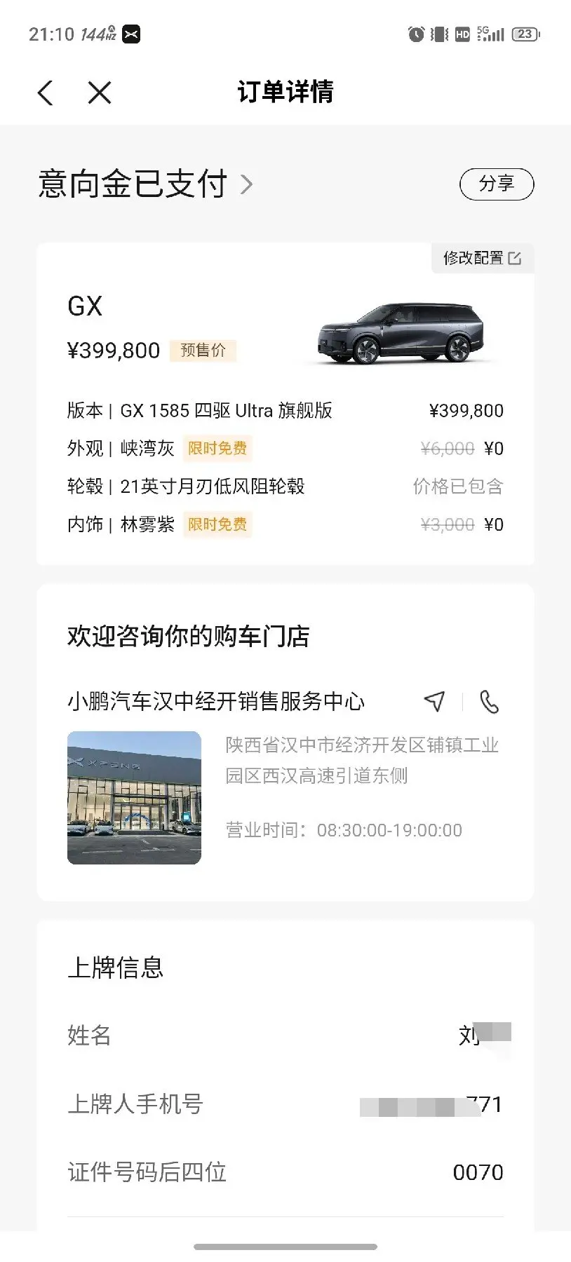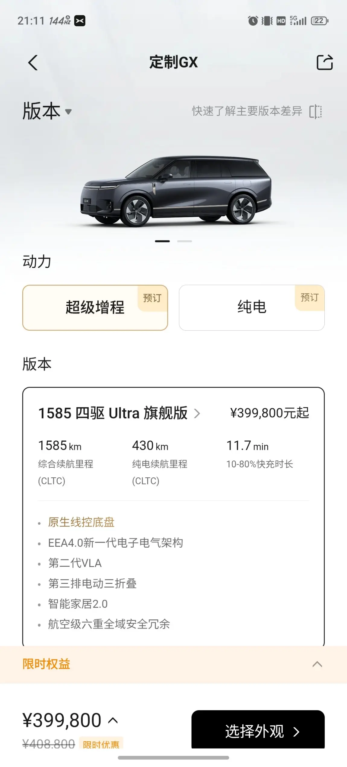 看到小鹏GX预售页面时,瞬间被峡湾灰外观击中,搭配限时免费的林雾紫内饰,高级感拉满。399800元的预售价入手1585四驱Ultra旗舰版,支付1000元意向金就能抵扣5000元购车款,还能免费拿下价值6000元的峡湾灰车漆与3000元内饰权益,性价比直接拉满,果断锁定汉中经开门店预订,开启旗舰出行新体验。