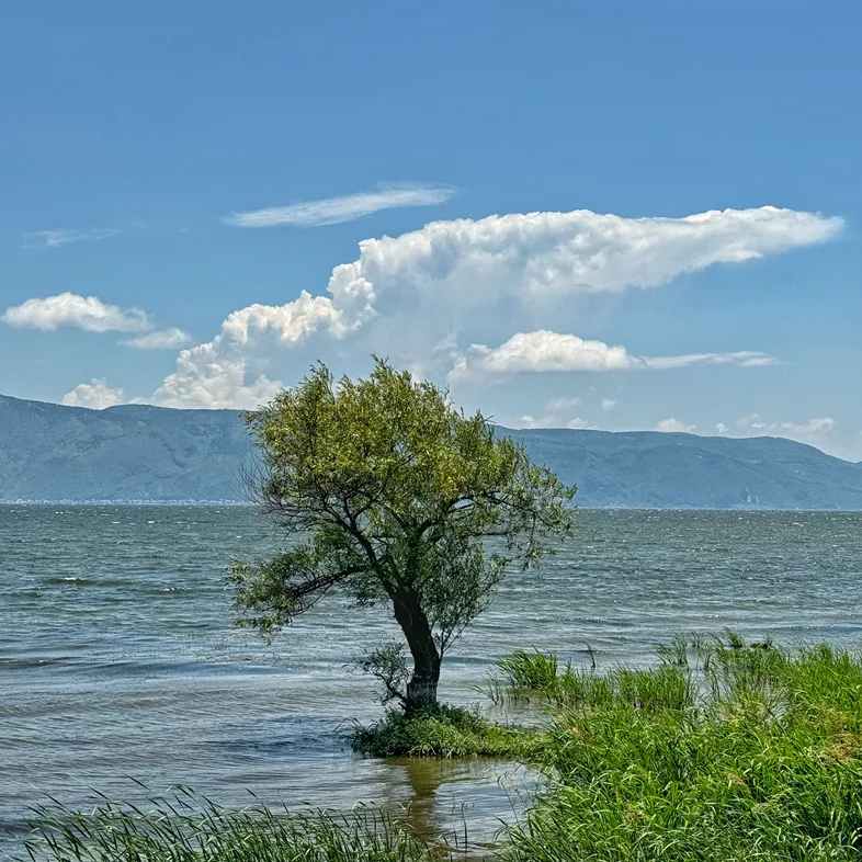 路过廊桥,坐在石拱门下,看湖水拍岸,听风穿过树梢,远处的苍山在云影里忽明忽暗;停驻在生态廊道,一棵孤树立于水畔,蓝天白云倒映在波光里,仿佛天地间只剩下这片宁静的呼吸。