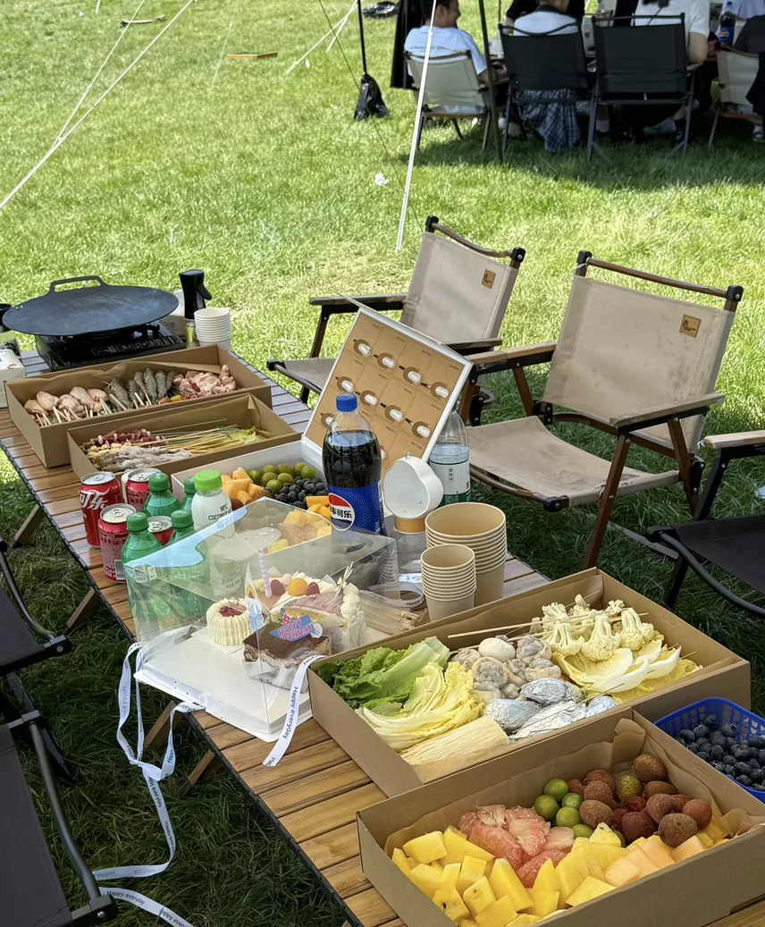 我们准备了满满一桌美食,烤肉串、水果、蛋糕、饮料,不用复杂厨具,也能拥有仪式感满满的露营下午茶。