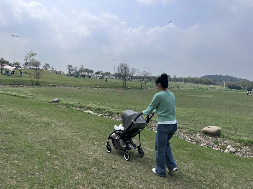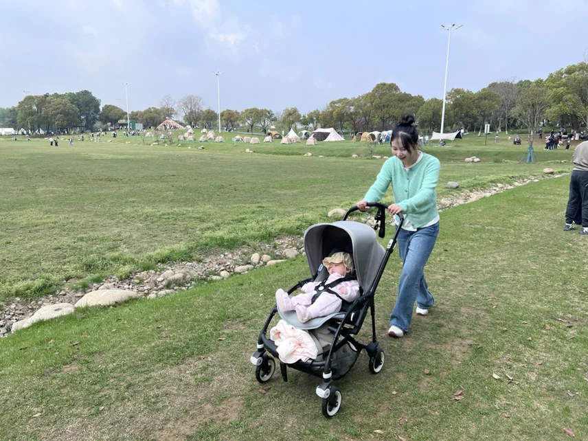 推着娃在草坪上散步,看风筝满天飞,一家人的快乐就是这么简单。