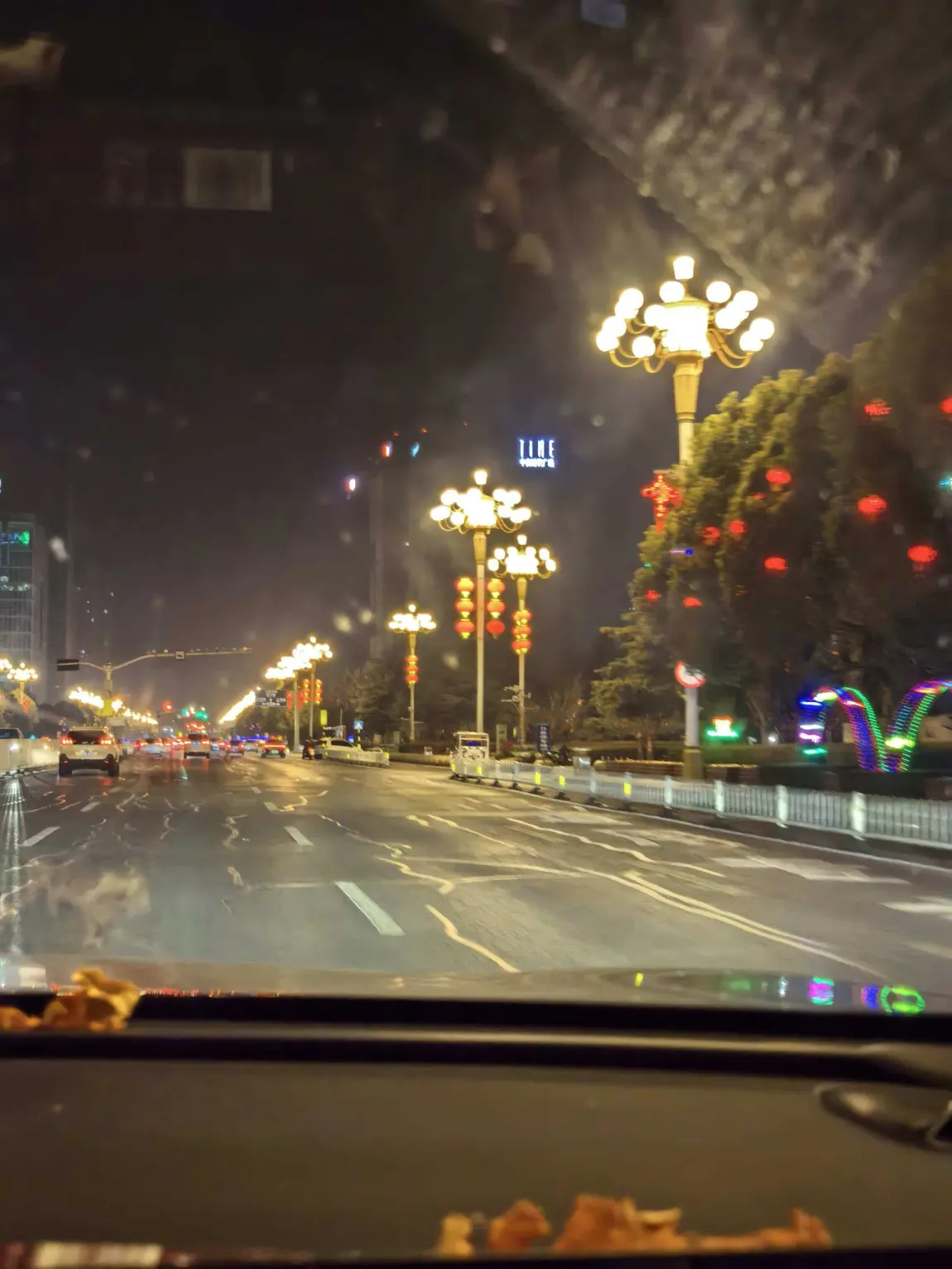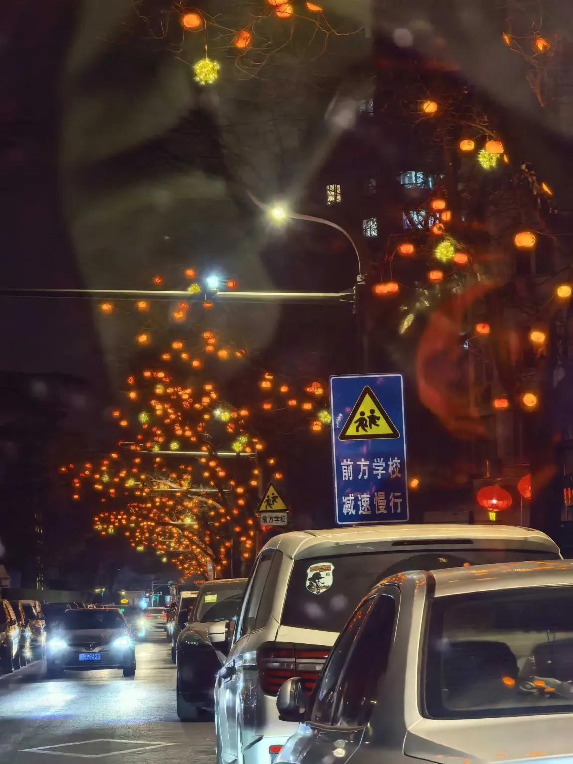 窗外是霓虹闪烁的街道,红灯笼高高挂起,路灯连成温暖的光河,雨珠打在玻璃上,晕开一片朦胧的烟火气;