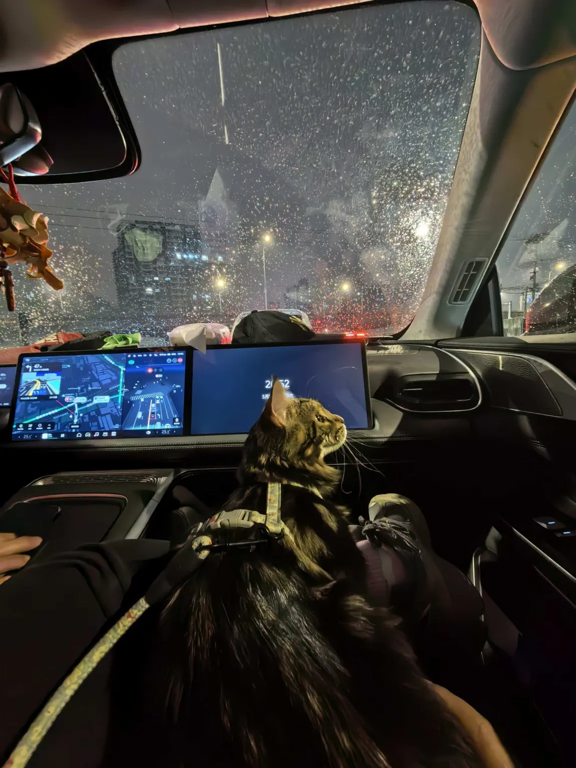 还有深夜的堵车时刻,我家缅因猫乖乖趴在副驾,陪着我一起看窗外的车水马龙,看城市的灯火一点点亮起。