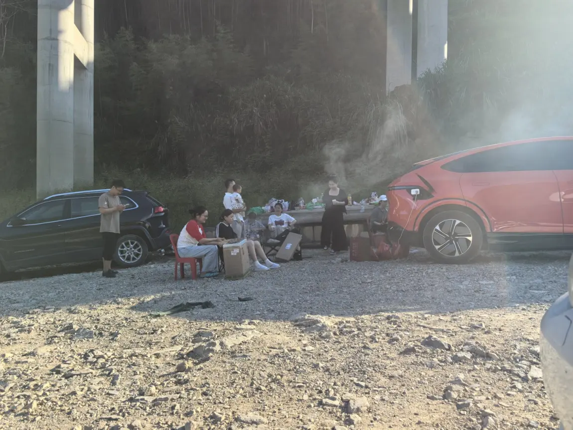 这片营地真的太绝了!溪边的草坪特别平整,溪水清澈见底,能看到小鱼在水里游来游去。我把小鹏G6停在溪边,打开后备箱拿出装备,超大空间轻松装下天幕、折叠桌椅、炊具和食材,连我的吉他都有地方放 。