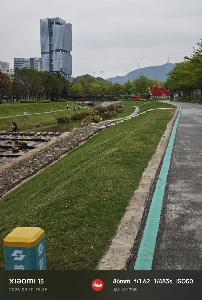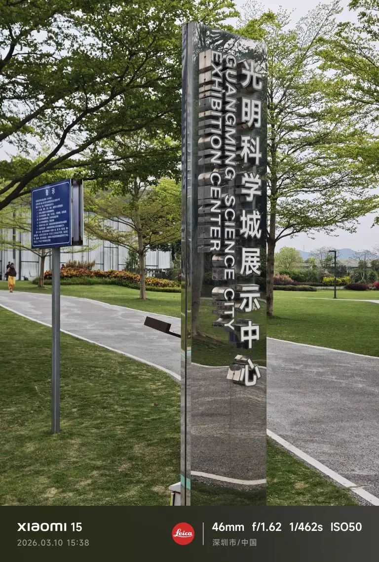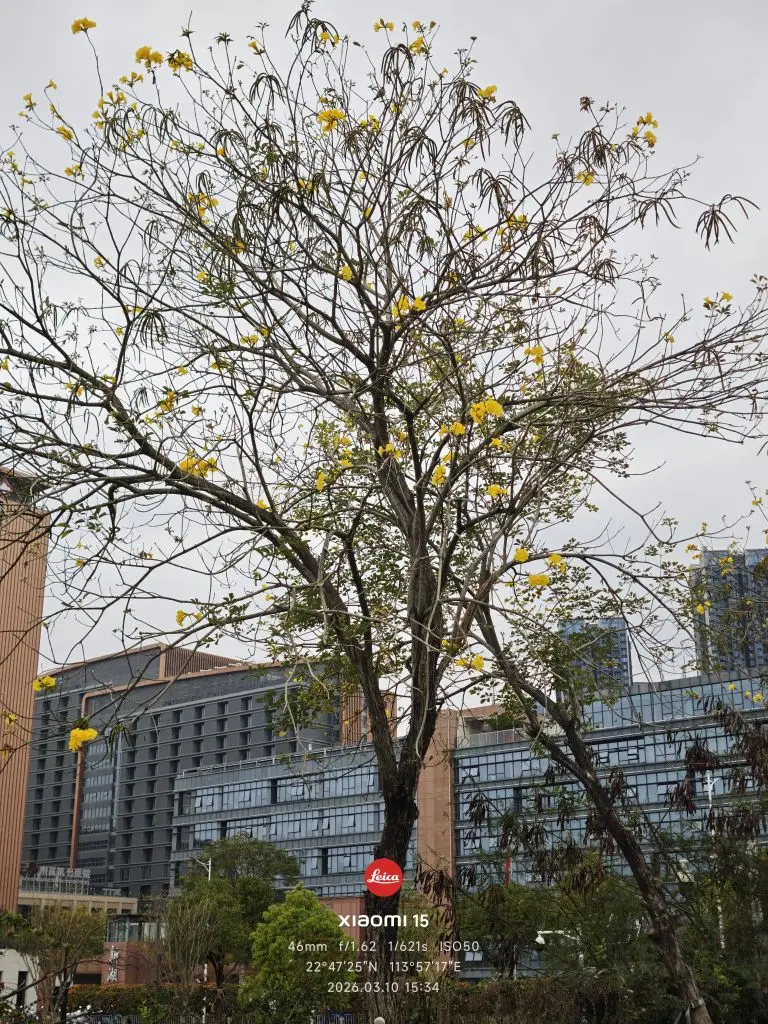 抵达光明科学城展示中心,现代感十足的建筑与绿意盎然的草坪相映成趣,随手一拍就是大片。沿着蜿蜒的步道漫步,两旁的树木郁郁葱葱,远处的高楼在云层下若隐若现,科技感与自然美完美融合。最惊喜的是路边那棵开满黄花的树,花朵在微风中轻轻摇曳,像撒了一地的阳光,赶紧用相机定格这份美好。