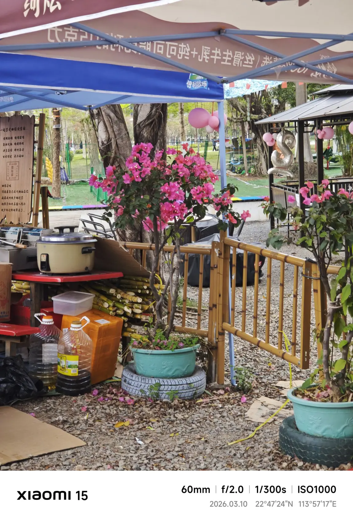 中午在户外市集小憩,粉色的三角梅开得热烈,竹制围栏和彩色气球增添了几分烟火气。坐在小鹏P7+的座椅上,透过全景天窗看蓝天白云,听着轻柔的音乐,疲惫一扫而空。
