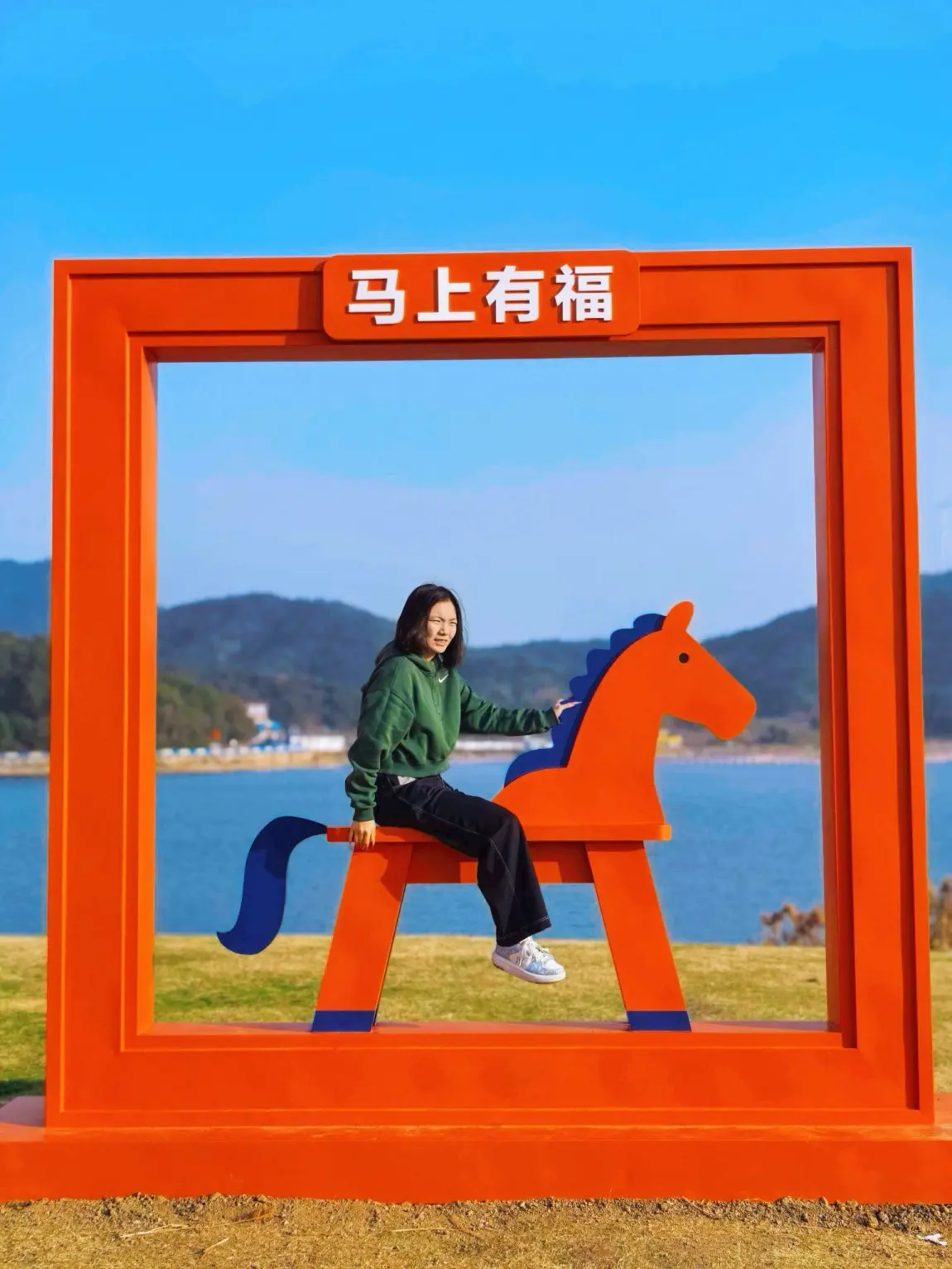 户外的「马上有福」装置,橙红的框架框住一整片湖光山色,坐上去就解锁了一整年的好运气;