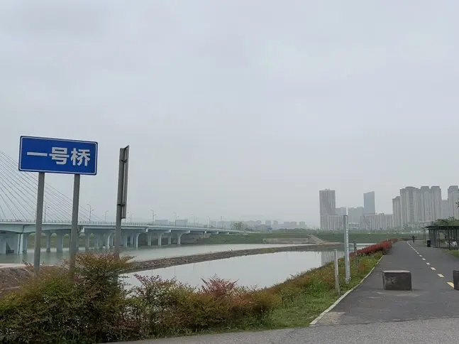 一号桥的蓝牌在眼前掠过,斜拉索桥像一柄舒展的玉簪,轻轻挽住了一江春水。灰蒙的天色里,江水泛着温柔的白,岸边长廊铺着沥青,黄线在路面上延伸出无限的松弛感。