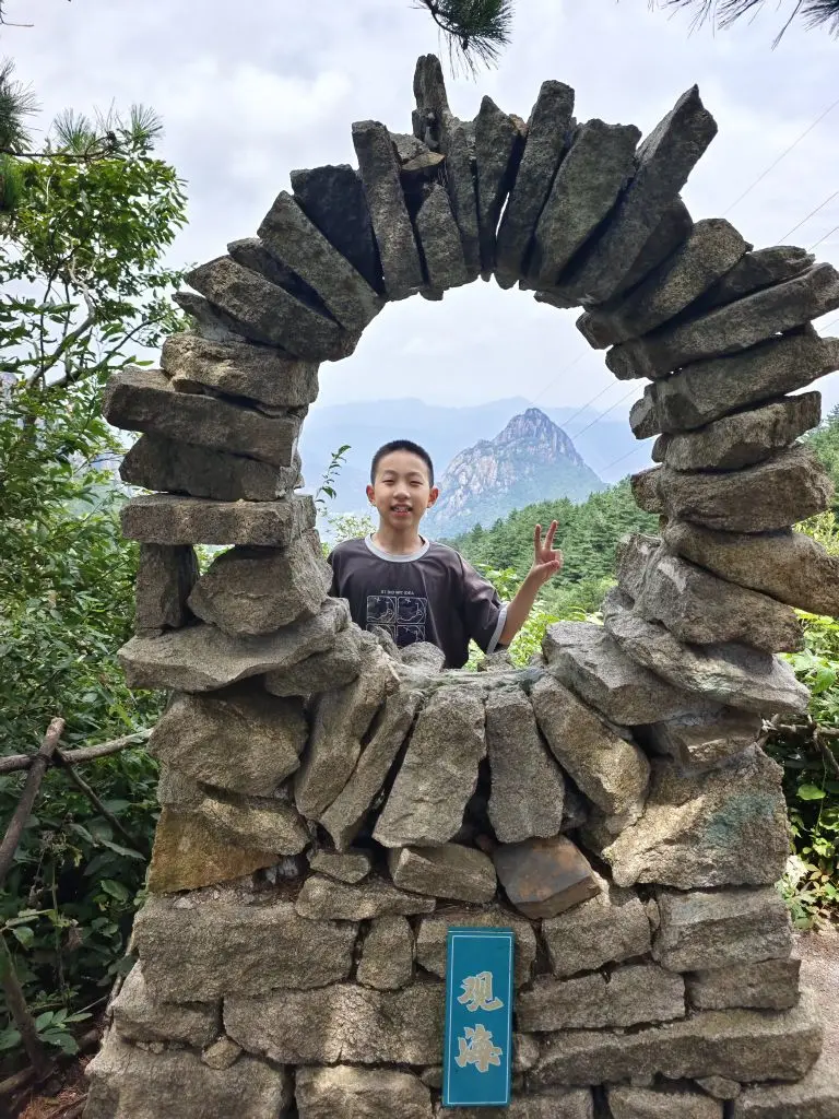 到了笔架峰,我找了个观景台停车。站在那里往远处看,群山像波浪一样铺展开去,一层比一层淡,最远的那层几乎融进了天空里。笔架峰真的像搁毛笔的架子,三座山峰并排立着,石壁陡峭得让人腿软。旁边有个骑摩托车上来的大叔,装备齐全,正举着手机自拍。他冲我喊:“这路爽吧?我每年都要来跑一次!”我冲他竖了个大拇指。