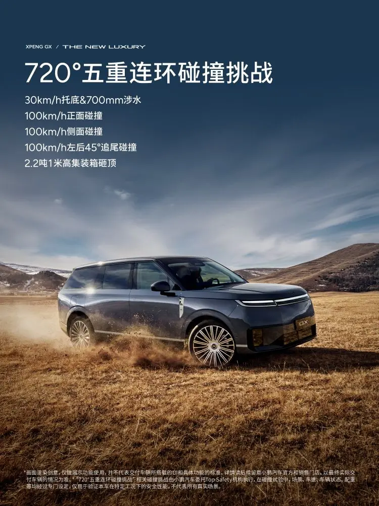 我想增购小鹏GX的目的就是需要长时间长途行车去更远的地方自驾游,自驾游途中不可控因素太多,安全隐患也多,而这次发布会上公布的小鹏GX航空级六重全域安全冗余真的给我打了一针强心剂,所谓安全就是最豪华的配置,一家人出去玩当然是要开开心心,安全归来,不但要让司机开的放心,也要让家人坐的安心。特别是720度五重碰撞挑战都通关的那一刻,我觉得这就是我想要的安全。