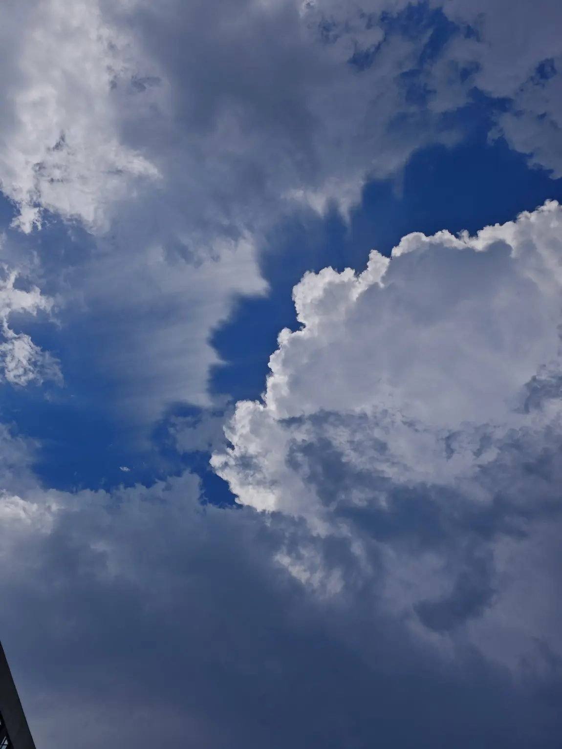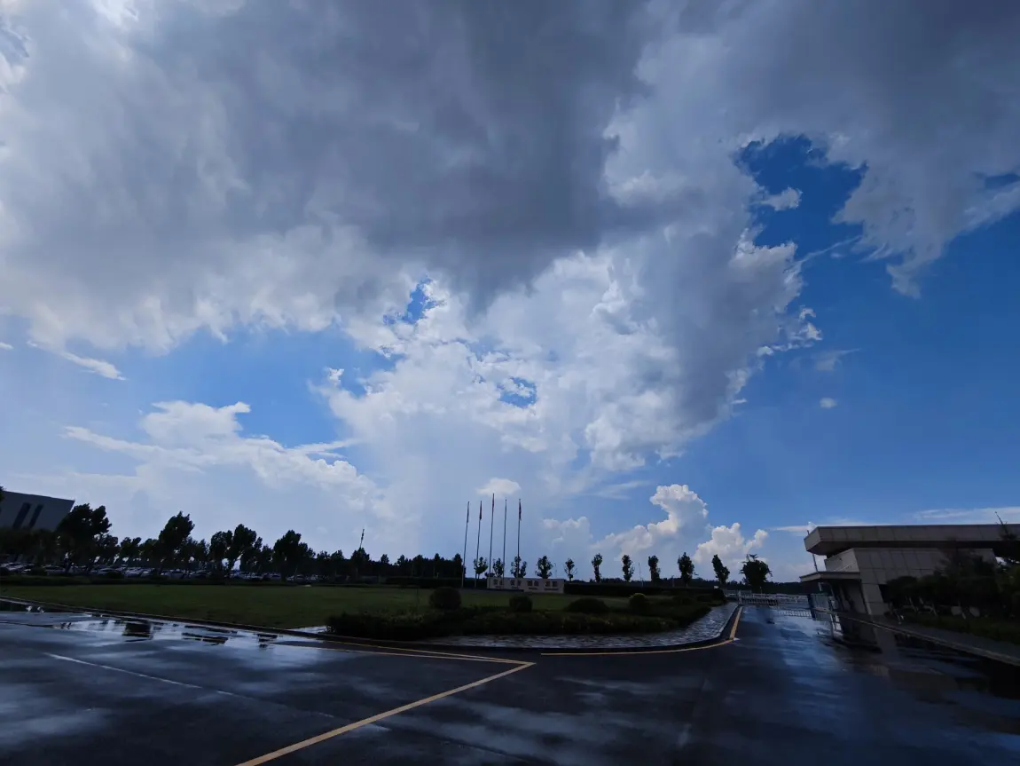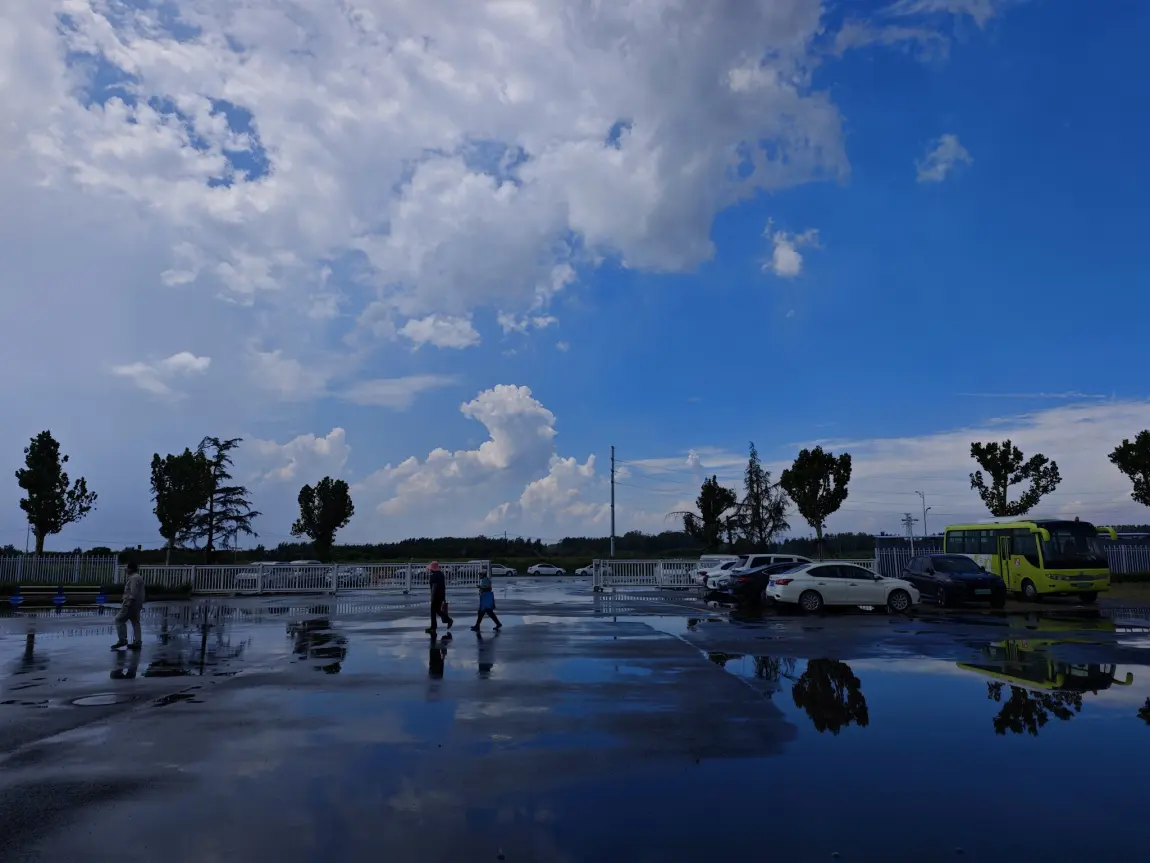 澄澈的蓝天铺展在头顶,大朵大朵的云像蓬松的棉絮,慢悠悠地浮着,把影子投在雨后的地面上。积水成了天然的镜子,映出颠倒的云、树、车,还有行人匆匆的脚步,虚实难分,像一场温柔的梦。