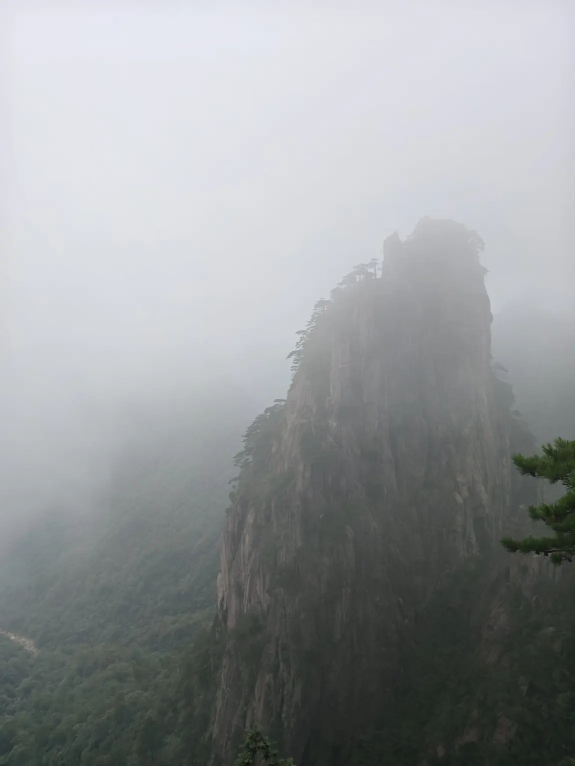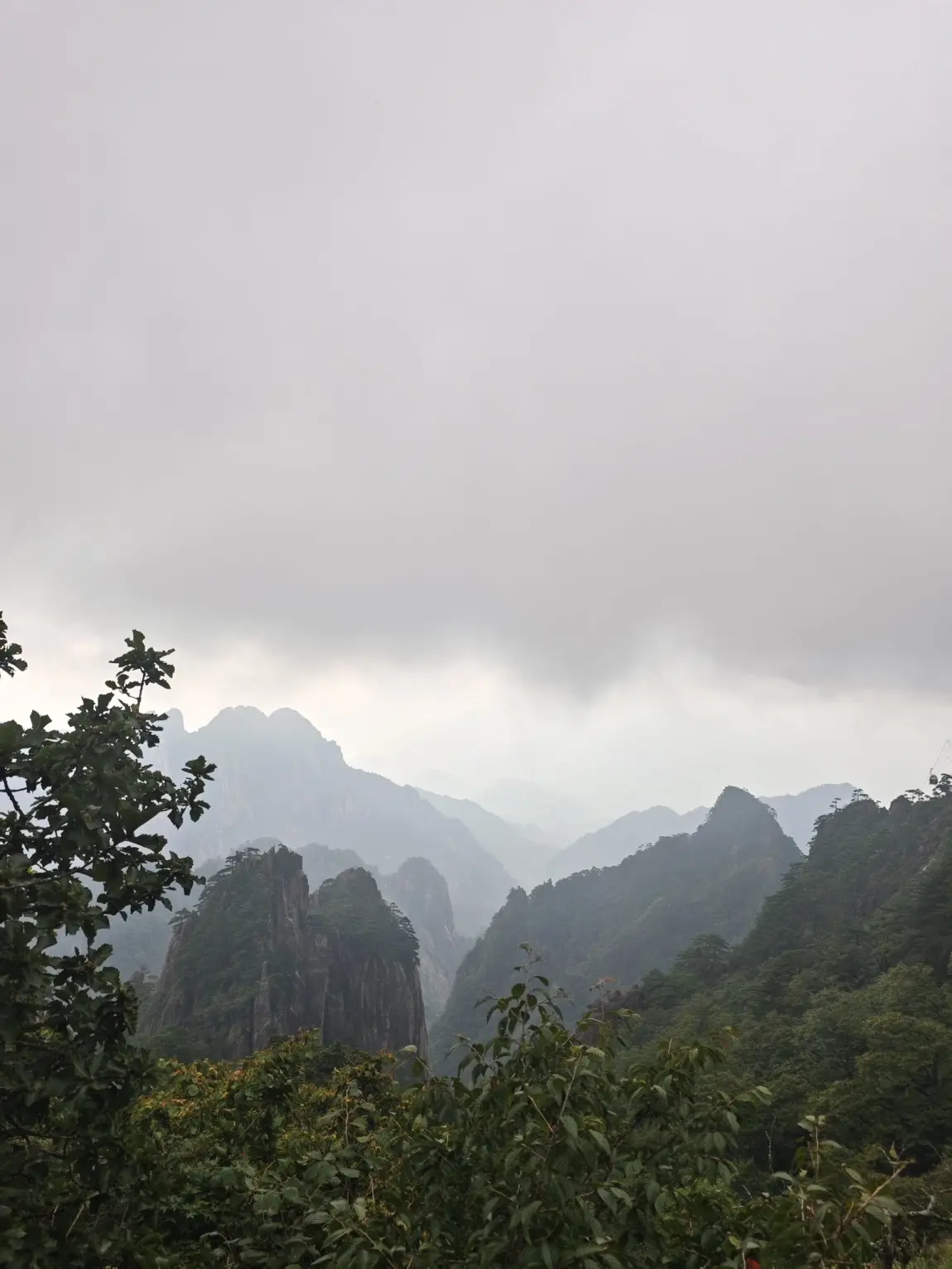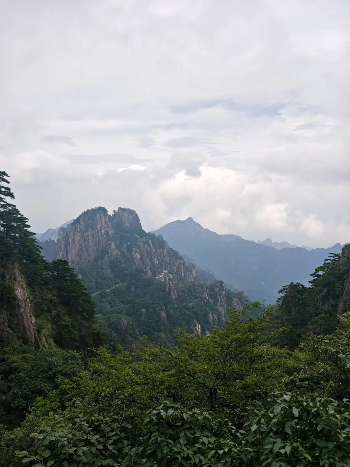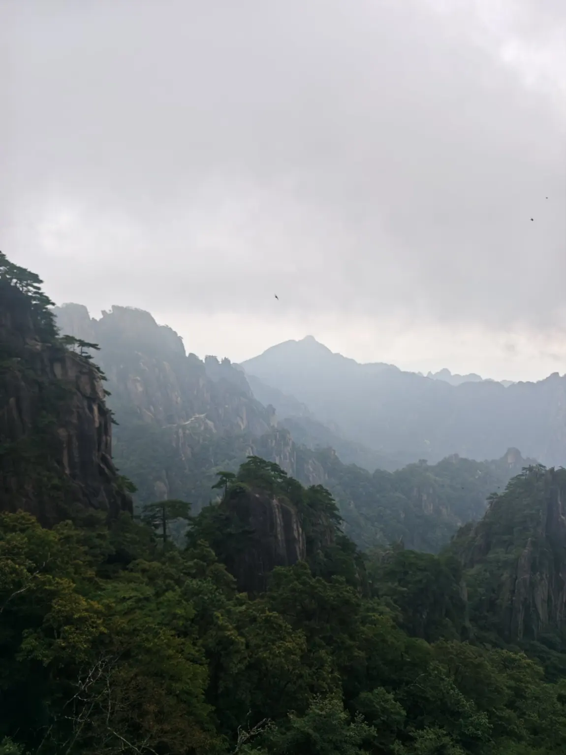 傍晚下山时,云雾渐渐散开,夕阳的光穿过云层洒在山峰上,把岩石染成温暖的橘色。原来黄山的美,藏在晴雨之间,藏在云雾里,也藏在每一次抬头的惊喜里。