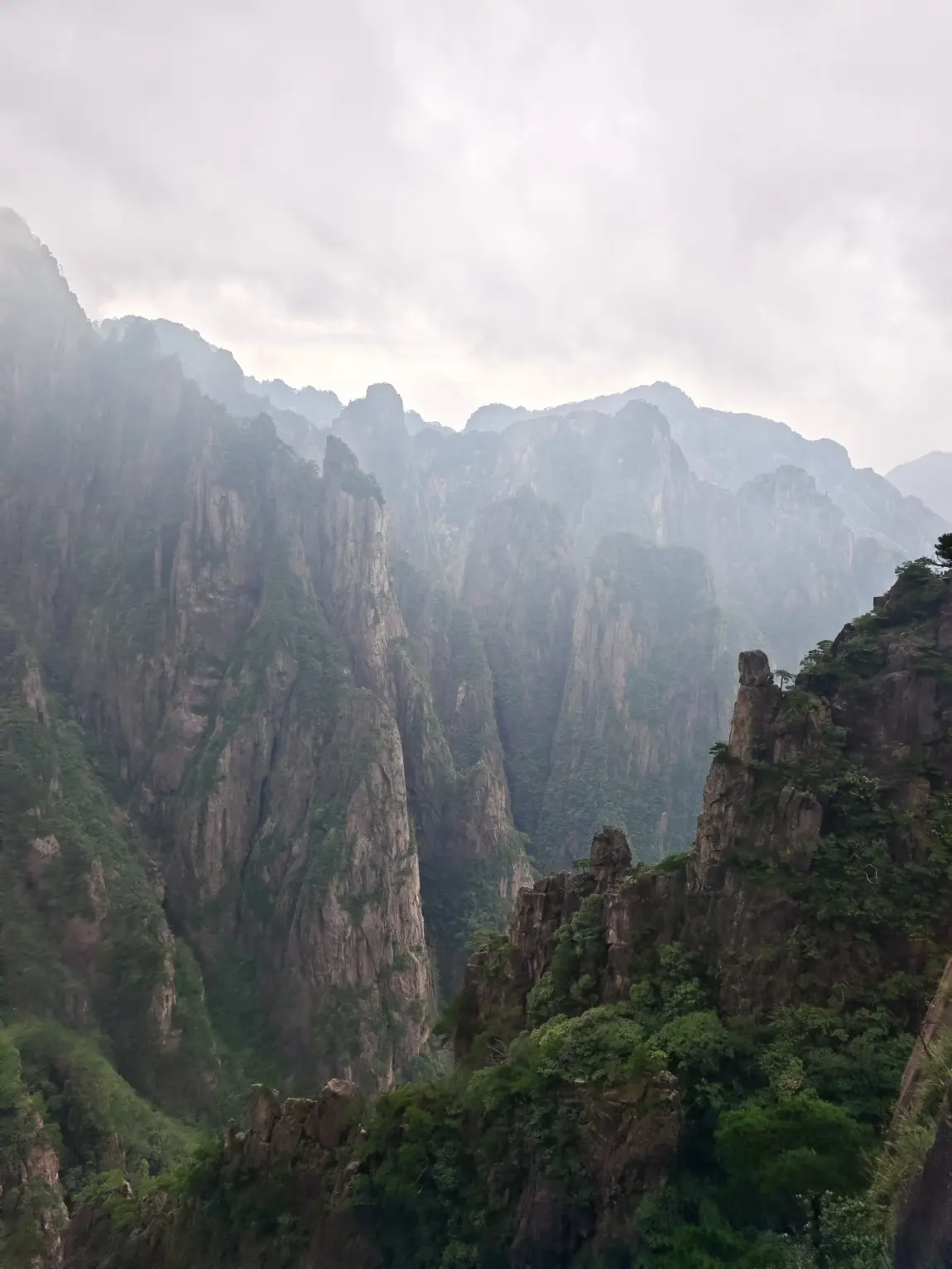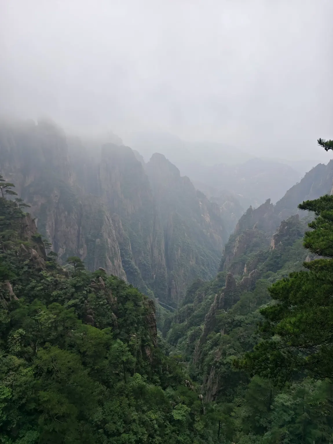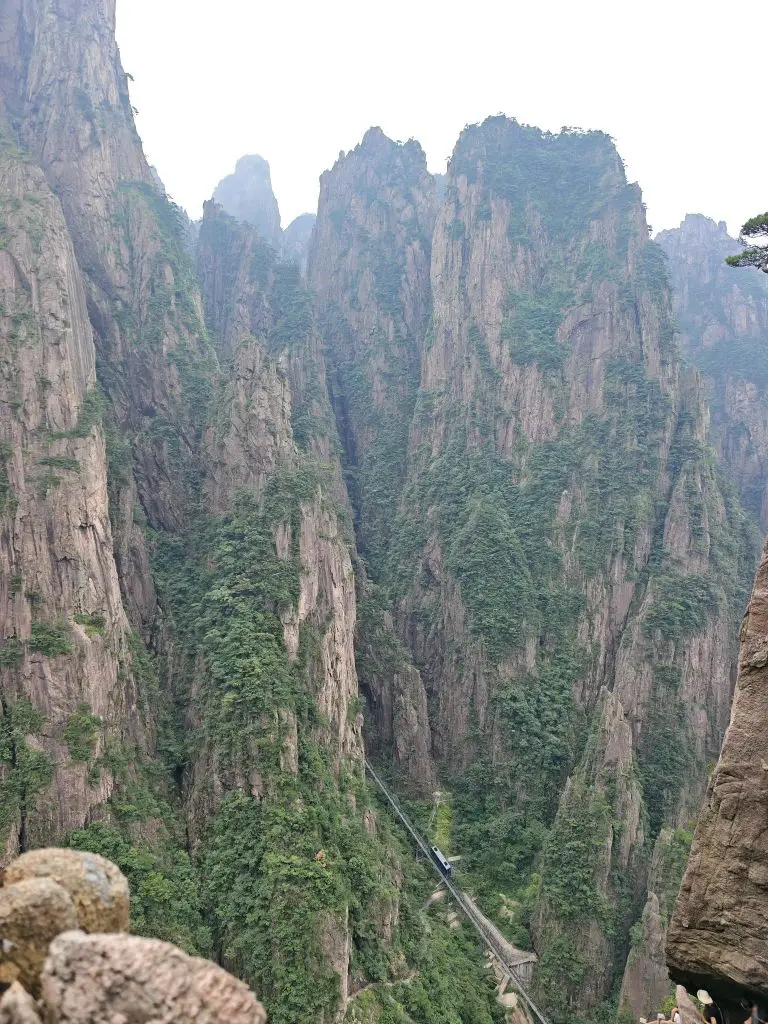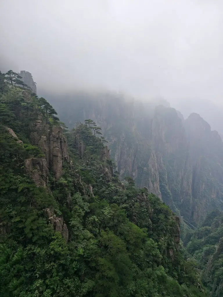 清晨上山时,云雾还缠着山腰不肯散去,远处的山峰只露出尖尖的顶,像在云海中浮沉的孤岛。坐西海大峡谷的缆车时,才真正被黄山的险峻震撼——刀劈斧削的悬崖,深不见底的峡谷,缆车穿行其间,像是闯入了仙侠剧里的秘境。
