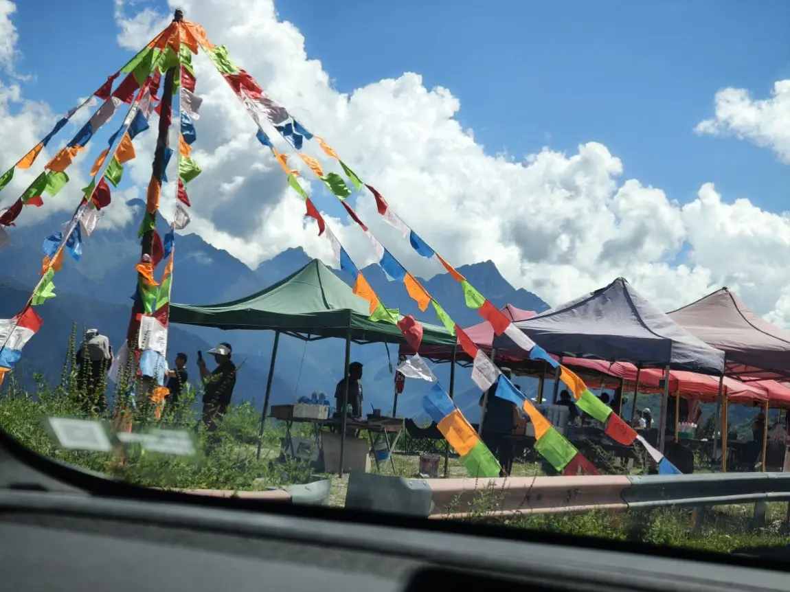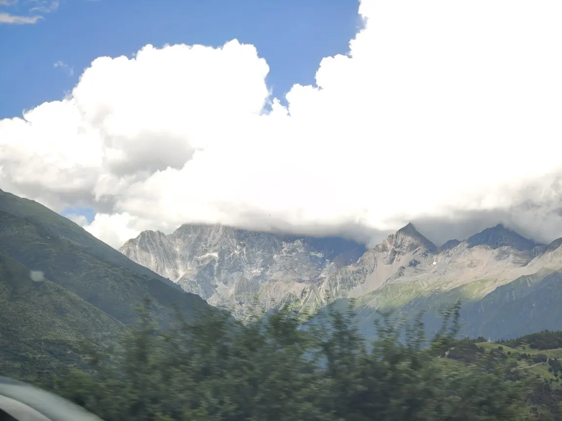 从成都出发,沿着熊猫大道一路向西。翻过巴朗山的那一刻,四姑娘山的幺妹峰猝不及防地出现在眼前——整座山尖覆着白雪,在蓝天下发着光。车里瞬间安静了,全家都趴在车窗上看呆了。海拔慢慢升高,但车里的暖风和音乐让人安心。