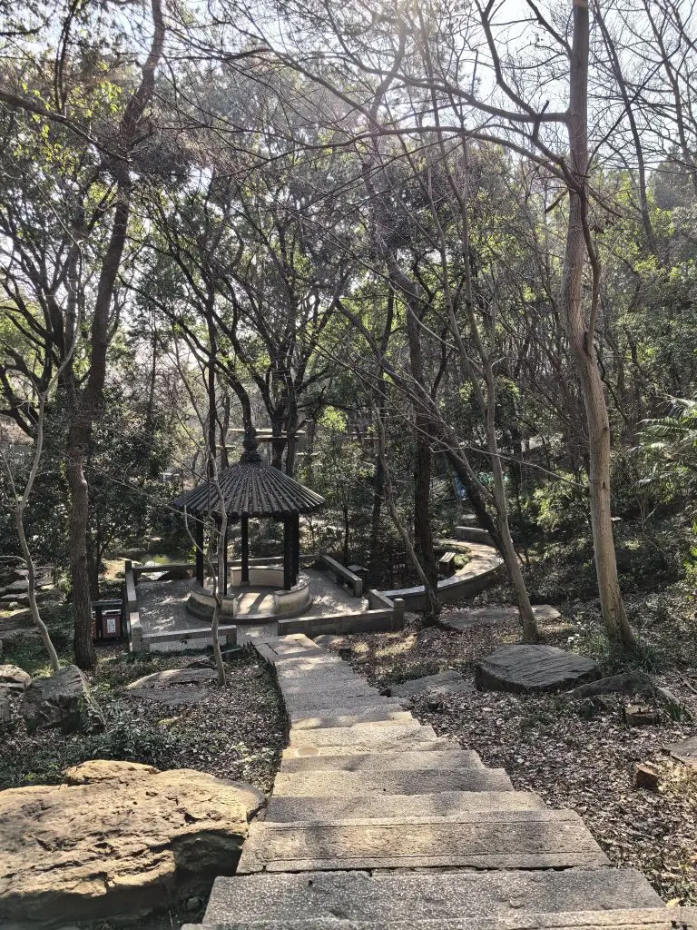 登山道修葺得很好,全程是规整的石阶或缓坡,对新手友好,但连续爬升对体力依然有要求。两侧古木参天,樟树、枫香、槭树遮天蔽日,即使是正午,林间也透着清凉。沿途会经过几座凉亭,可以停下来歇脚、喝水,听风吹过竹林的沙沙声。