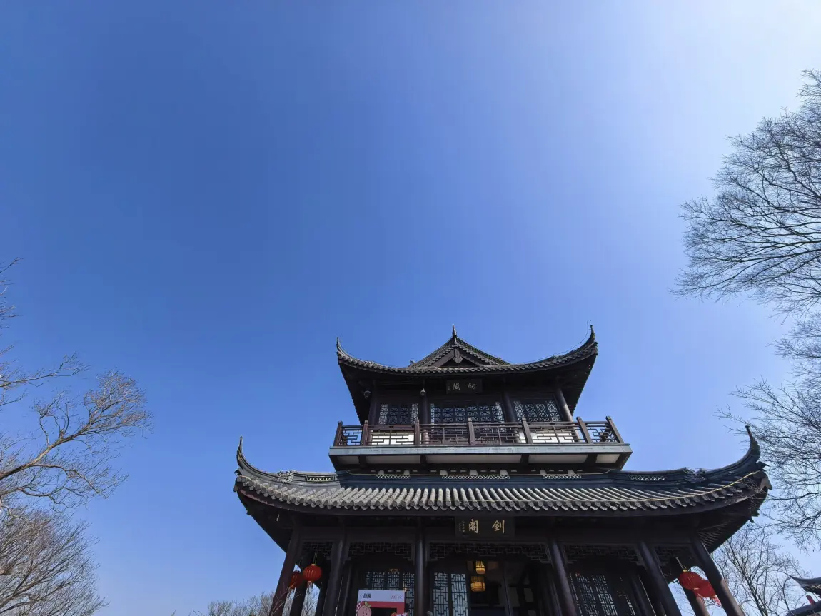 山顶的核心建筑是剑阁,一座两层重檐的仿古楼阁,登楼视野更佳,是拍照的绝佳机位。不远处就是藏海寺,黄墙黛瓦,香火缭绕。寺庙不大,但胜在清幽,门前有几棵古树,树荫下摆着石桌石凳,可以坐下来喝杯茶,听听钟声。