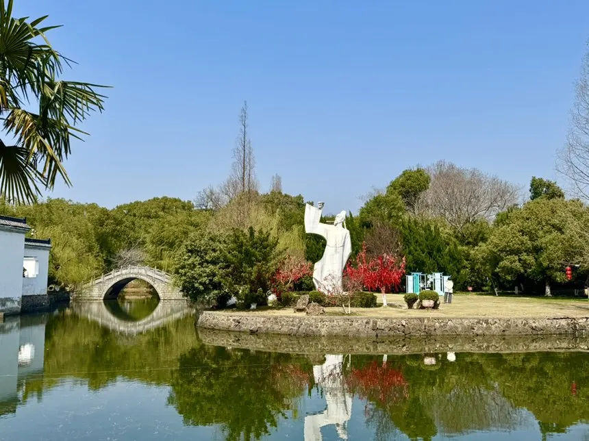 春风拂柳,碧波荡漾,远处的李白雕像静静伫立。走在园区的石板路上,连空气里都飘着诗词的味道。不得不说,春日的江南,真的随手一拍都是水墨画。这尊举杯邀月的雕像真的太有氛围感了!倒影映在湖面上,虚实交错,好像诗仙真的在与明月对饮。这一刻,终于懂了什么叫“酒入豪肠,七分酿成了月光”。