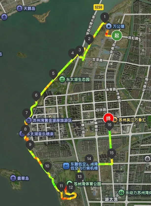 周末特意选了苏州湾体育公园摩途咖啡驿站到万公堤的路线,单程10公里出头,往返21公里,全程25公里的湖景骑行道,把太湖的温柔风光尽收眼底🌊