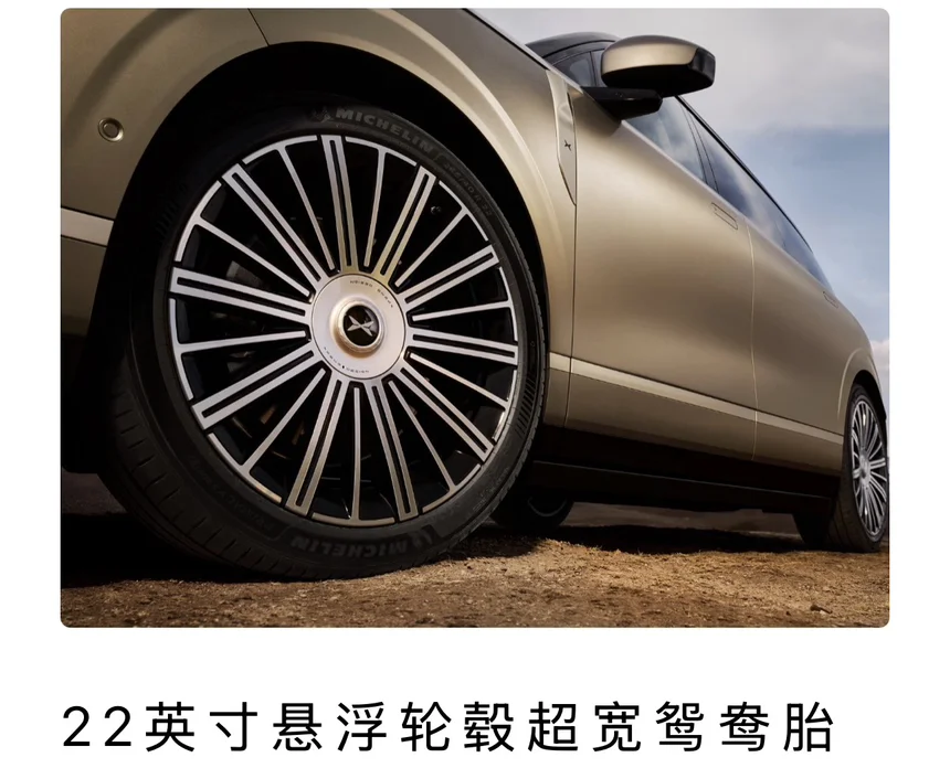 外观方面:小鹏GX首发太空陶瓷24K金标,航天级氧化锆陶瓷基底+24K真金PVD真空镀金,莫氏硬度8.5级媲美金刚石,洗车一万次也不留划痕。这枚历经33天15道工序打磨的金标,不仅是身份的象征,更是小鹏把百万级豪华配置下放的诚意。22英寸多辐悬浮轮毂,搭配前265mm/后285mm超宽米其林鸳鸯胎,视觉冲击力拉满的同时,带来更强的抓地力和行驶稳定性。5.2米的庞然大物,也能拥有行云流水的操控体验。