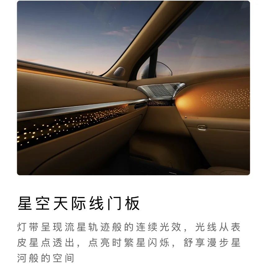 把银河搬进车里,星空天际线门板采用星绒透光皮革材质,灯带呈现流星轨迹般的连续光效。