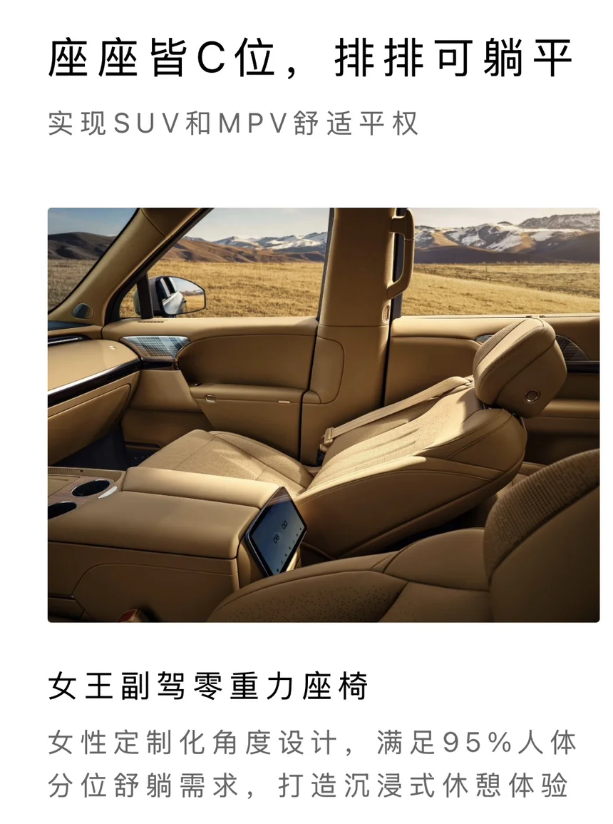 女王副驾零重力座椅,专为女性定制化角度设计,满足95%人体分位舒躺需求,长途出行再也不累。