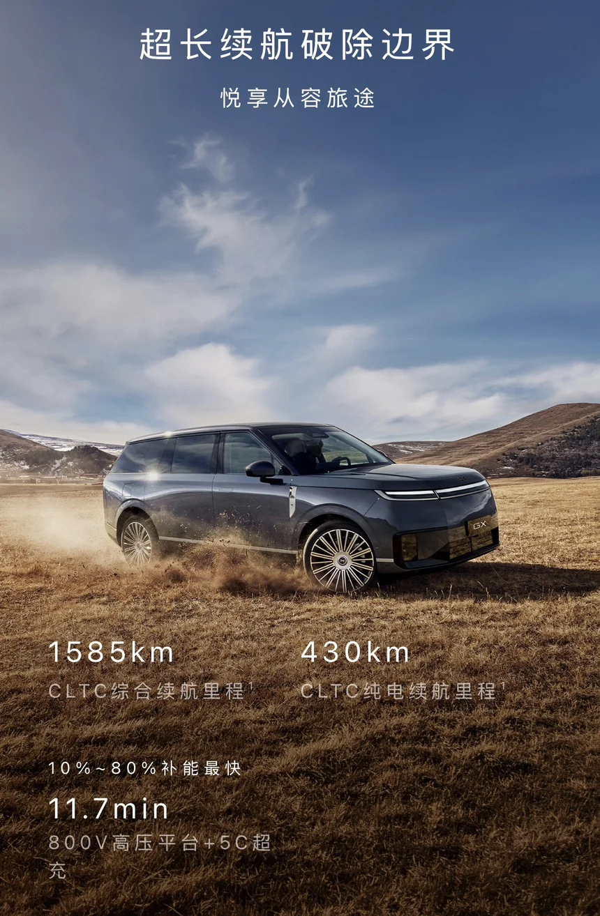 续航方面:超级增程版CLTC综合续航1585km,纯电续航430km;纯电版CLTC续航750km。
