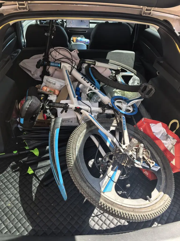 没想到快到家时,自行车链条突然“罢工”,只能呼叫爸爸开Mona来救场。本来还担心装不下自行车,结果后备箱直接把整辆车、背包和装备都安排得明明白白,空间大到超出预期,妥妥的户外出行神器。