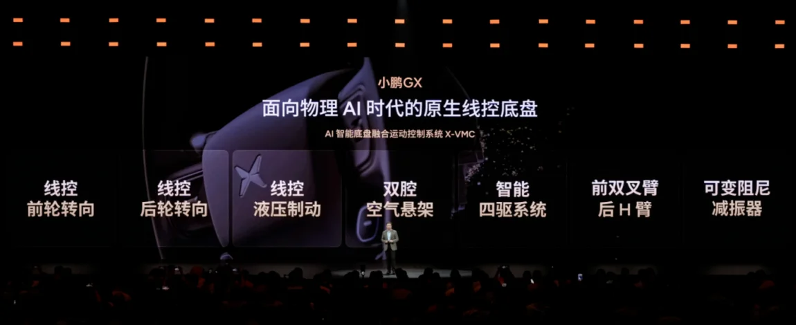 4️⃣底盘技术:底盘一直是小鹏强项,GX用上原生线控转向配合后轮主动转向技术,让这台5.2米的大车转弯半径仅5.4米(同级最小),标配双腔空气悬架和CDC阻尼减震。