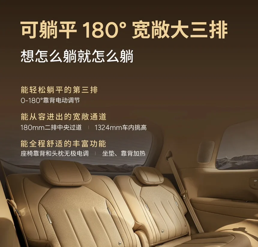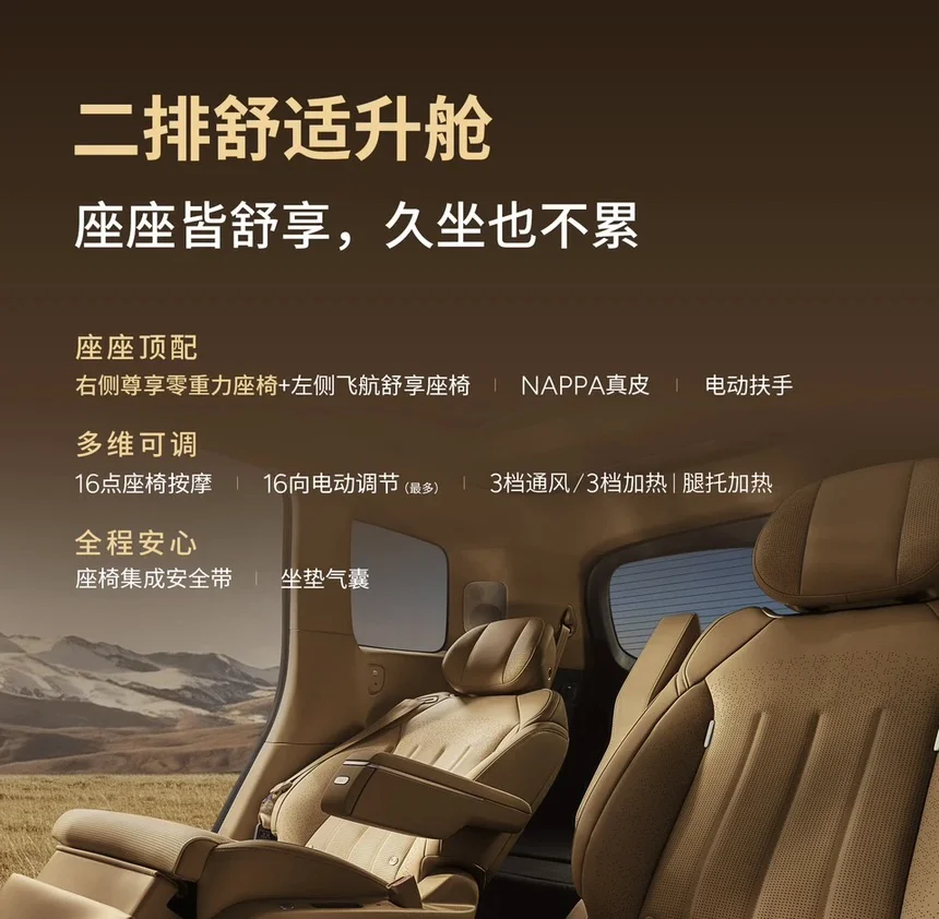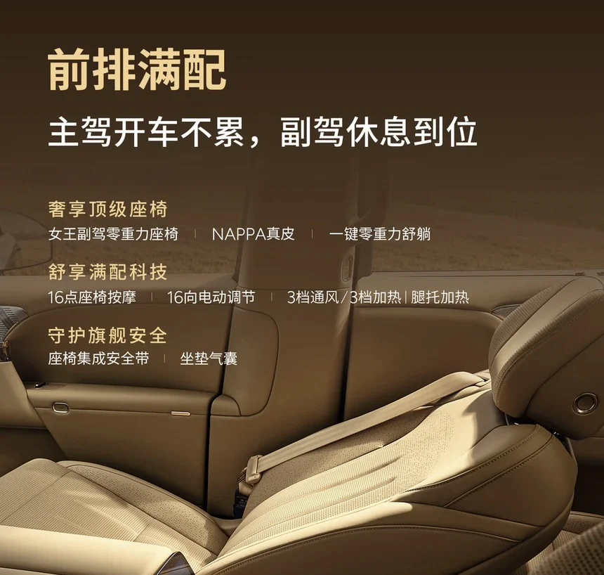 尤为亮眼的是它对舒适的理解:女王副驾零重力座椅,支持一键躺平、16点按摩、16向电动调节,并具备通风与加热功能,将专属尊享做到极致。