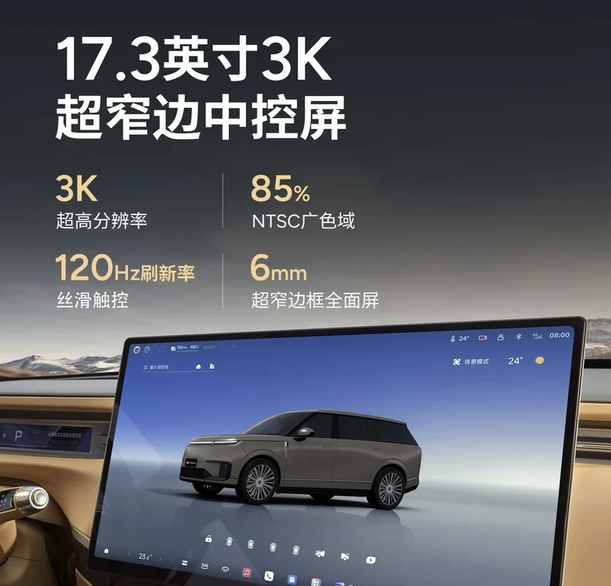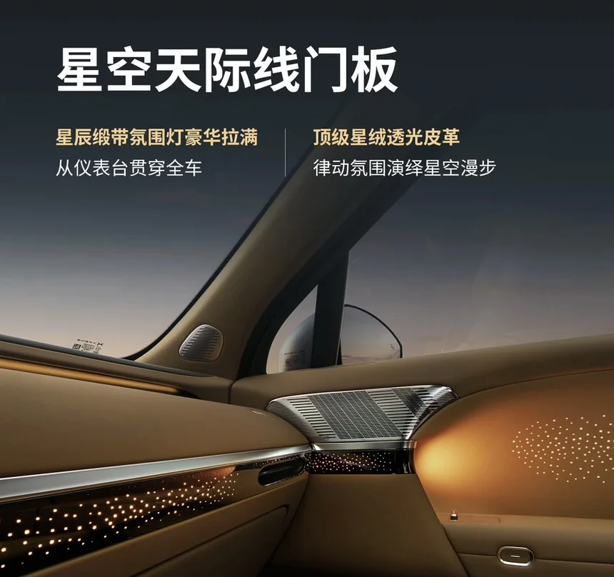 17.3英寸3K超窄边中控屏如同悬浮的宇宙控制中枢,88英寸超大AR-HUD将行车信息与现实路况完美融合,而“星空天际线门板”则以氛围灯光模拟星空,将科技与浪漫情怀巧妙结合。