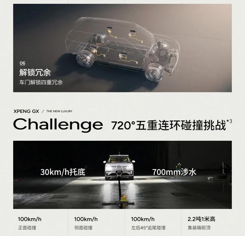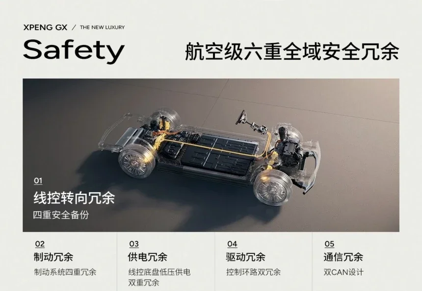 真正的豪华,基石是无所不在的安全。小鹏GX带来了极具前瞻性的航空级六重全域安全冗余系统,为安全上了“多重保险”: