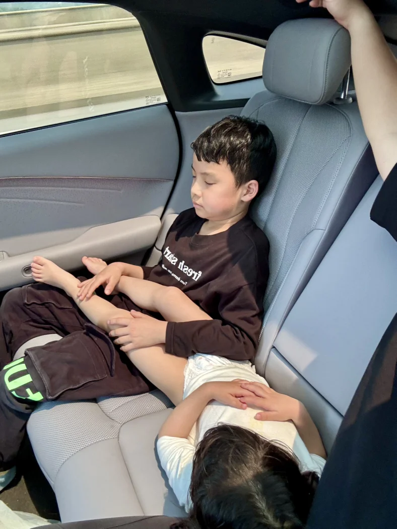 出发前还在担心夏天长途坐车会闷热,没想到P7+的全景天幕直接给了我惊喜。室外37度的高温,太阳直晒下,车内也完全没有闷罐感,隔热效果真的绝了!两个娃在后排睡得安安稳稳,一点都没喊热,全程都没怎么闹脾气,这趟旅途的“带娃难度”直接减半。