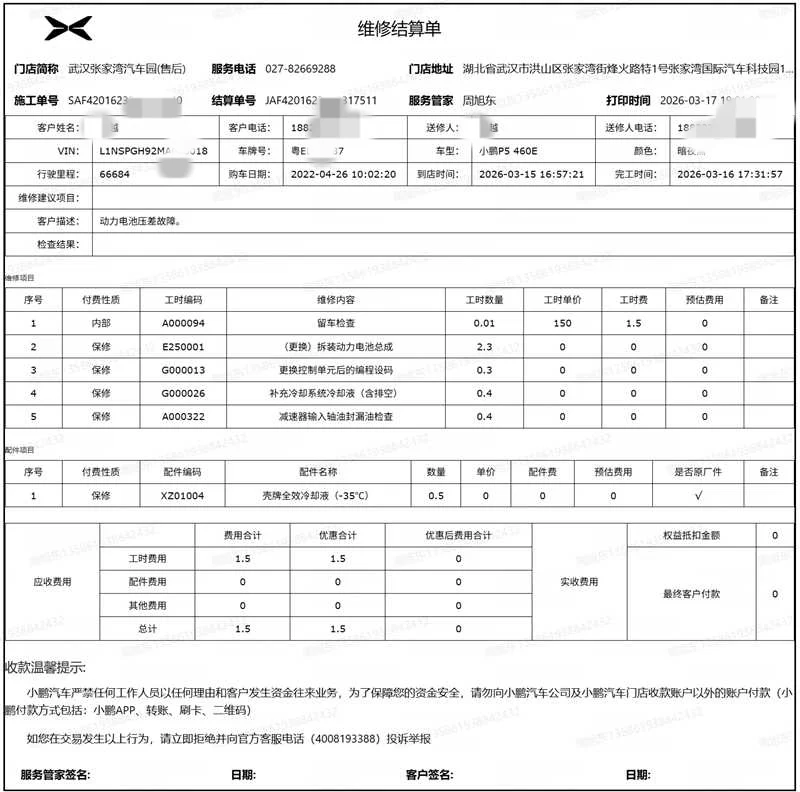 转眼到了今年3月,怕什么来什么,老毛病又复发了!还是停车库一夜,第二天直接狂掉续航,和去年故障一模一样。我没多犹豫,直接开车直奔小鹏武汉张家湾4S店,想着赶紧把电池问题彻底搞定,安心开车。