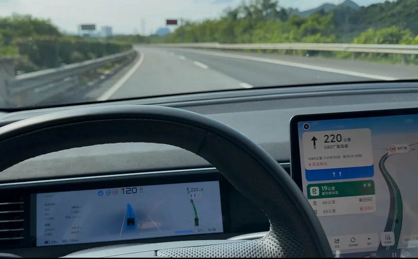高速上直接开启智驾,方向盘稳稳的,我只用扶着就行,不用一直紧绷着神经。中控屏上的导航清晰得很,看着“还有220公里”的提示,完全不慌。