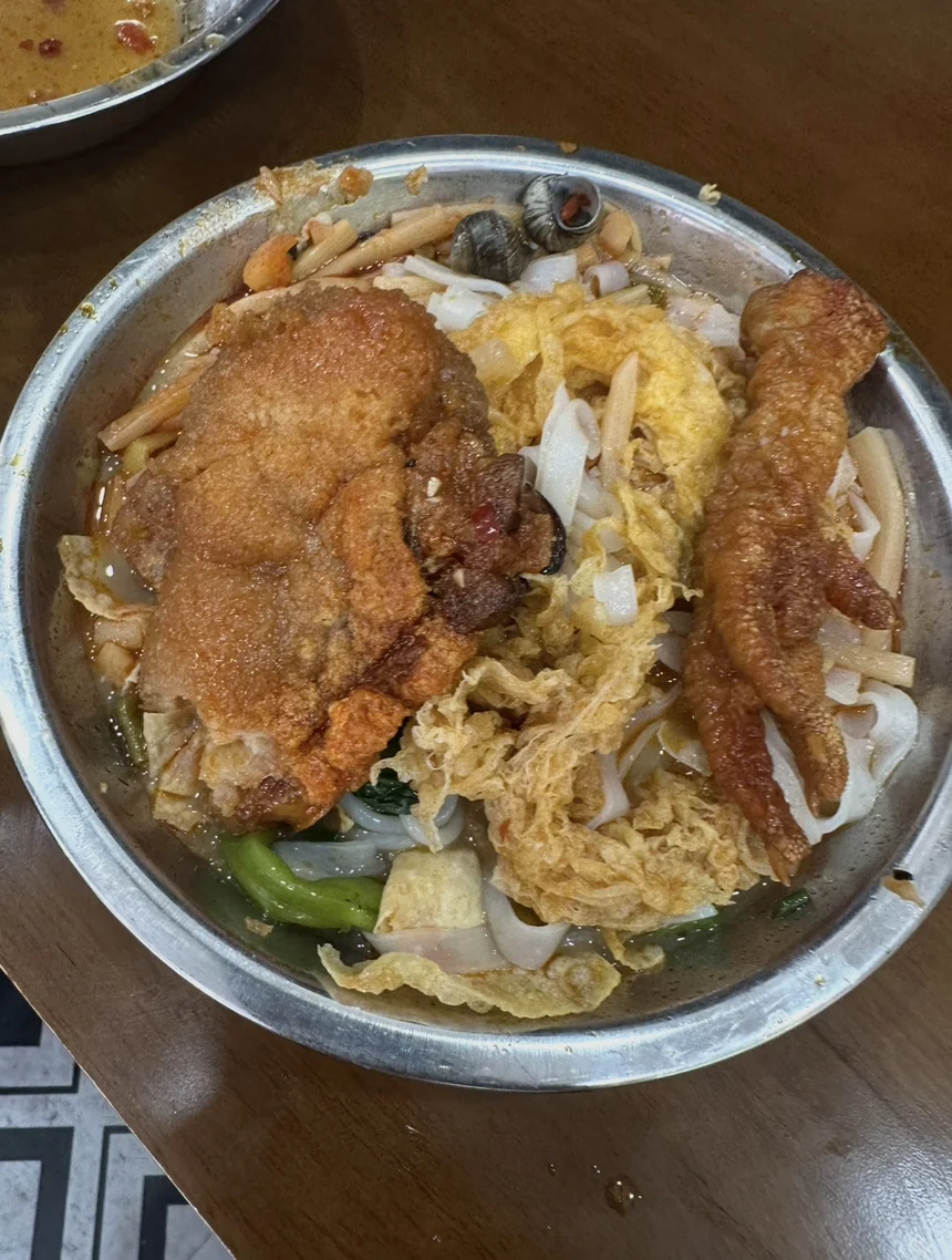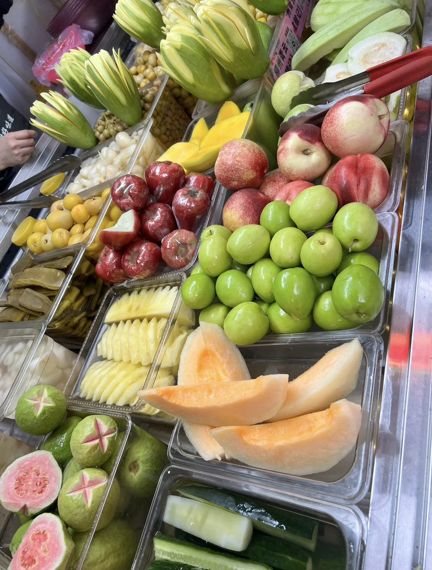 我买了酸芒果、脆李子,酸甜脆爽,孩子吃得停不下来;还有糯米饭,加了腊肠和脆哨,香到跺脚!晚上还在市场门口嗦了一碗螺蛳粉,加了炸猪脚和卤蛋,汤头鲜得不行,连汤都喝了大半!