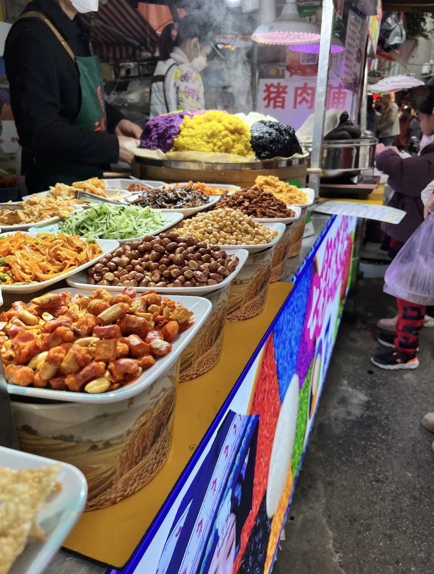 巷子里还有很多本地小吃店,买了五彩糯米饭,紫米、黄米、黑米混在一起,裹上白糖,糯叽叽的超好吃!
