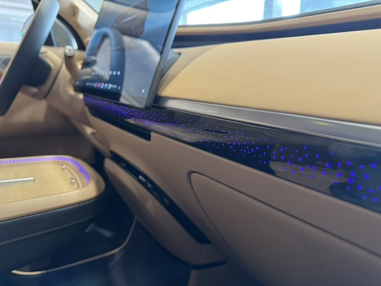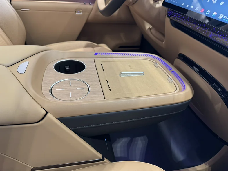 另外车内的配置也是非常的豪华舒适,前排空中悬浮岛台非常有设计感,还搭配了一圈氛围灯,黑暗状态下更有质感。